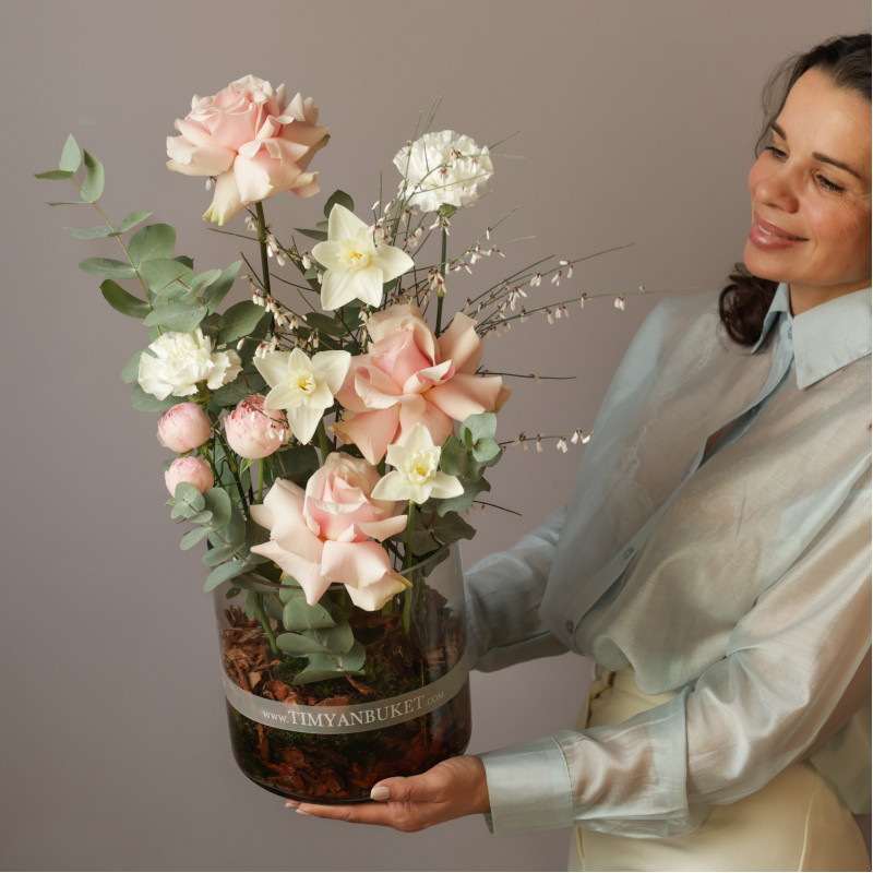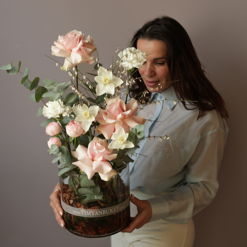 Элегантная композиция с характером: нежные французские розы и тюльпаны мягко оттеняют солнечные нарциссы, а диантус и эвкалипт добавляют глубины и текстуры. Высокий стеклянный цилиндр подчёркивает вертикаль и чистоту линий, делая композицию особенно выразительной.