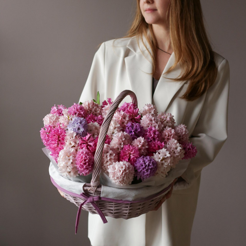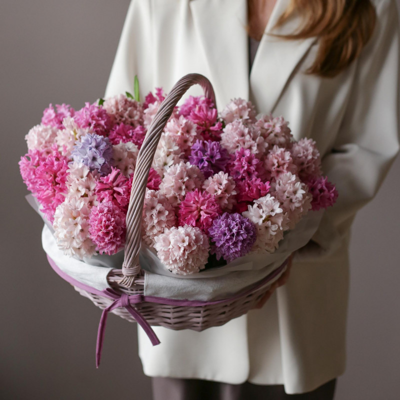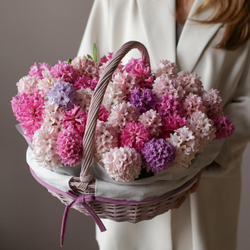 Ароматная композиция разноцветных гиацинтов в плетеной круглой корзинке.