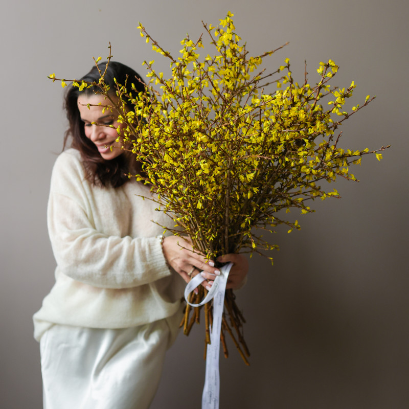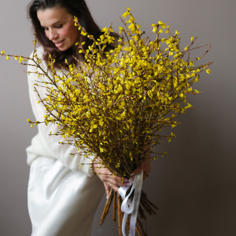 Весенний букет из веток форзиции — минимализм, свет и ощущение первого тепла. Изящные ветви, усыпанные ярко-жёлтыми цветками, создают эффект лёгкости и живой динамики. Форзиция ассоциируется с самым ранним пробуждением природы и привносит в пространство солнечное настроение даже в пасмурный день. Лаконичная подача без упаковки подчёркивает природную красоту веток.