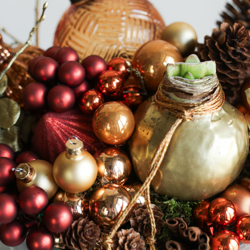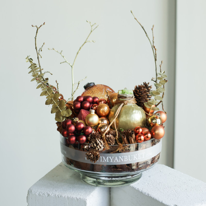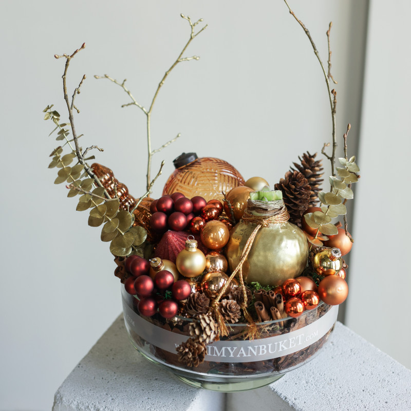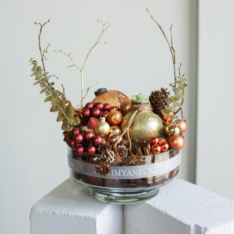 Зимняя композиция в прозрачной стеклянной вазе с луковичным амариллисом в золотом воске — эффектный и нарядный акцент, который моментально создаёт праздничное настроение. Луковица украшена золотым покрытием и выглядит эстетично даже до начала роста. Амариллис постепенно выпускает стрелку и распускает крупные цветы, превращаясь в живую деталь интерьера. Щепа, декоративные ветки, эвкалипт, шишки и новогодние шарики формируют стильный, насыщенный образ, который подходит для подарка и для украшения дома.