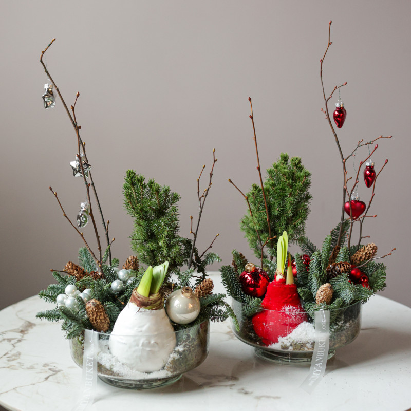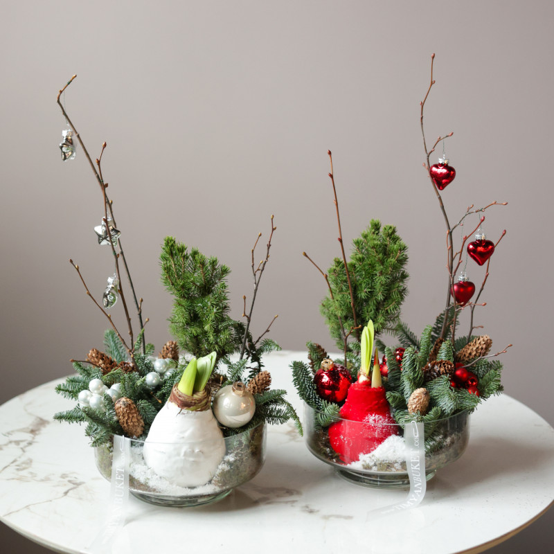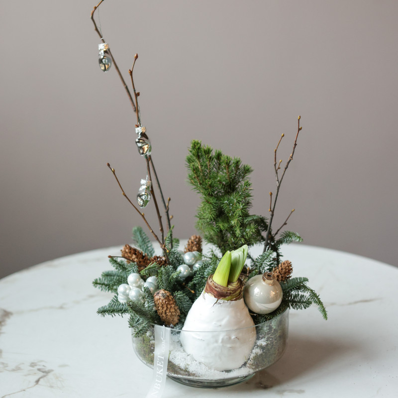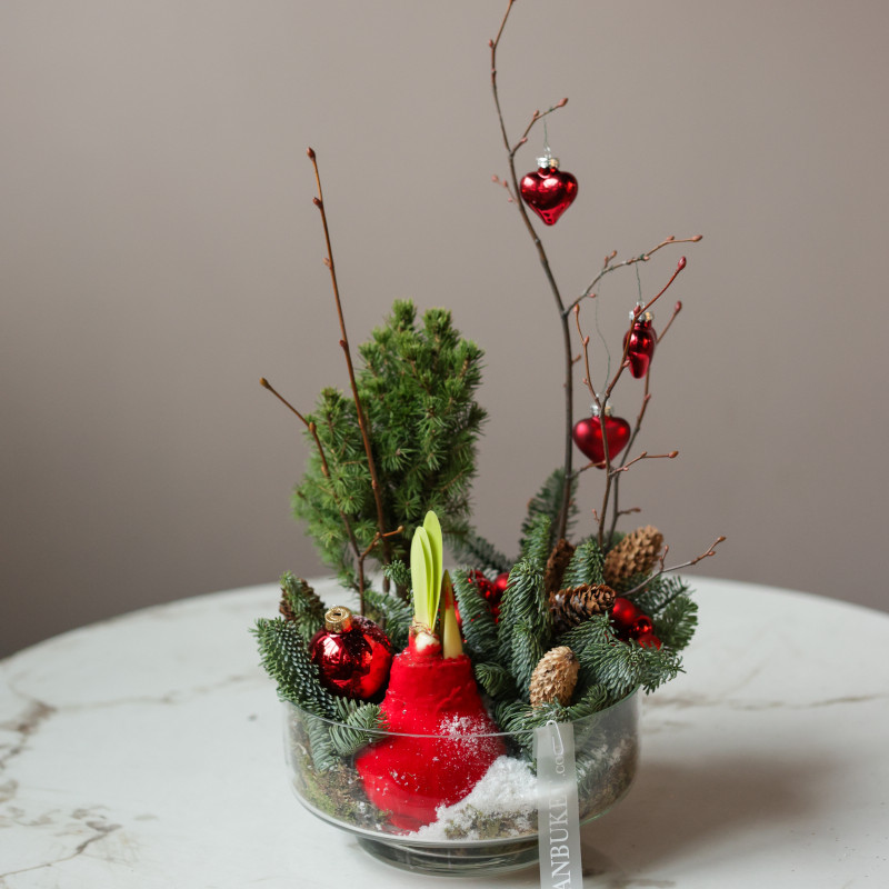 Зимняя композиция в стеклянной вазе с луковичным амариллисом — стильный и аккуратный праздничный акцент, который создаёт атмосферу зимнего уюта. Луковицы представлены в ассортименте: в белом или в красном воске. Амариллис постепенно просыпается, выпускает стрелку и раскрывает крупные цветы, превращаясь в живую декоративную деталь, за которой приятно наблюдать. Свежая хвоя, декоративные ветки и новогодний декор создают чистый, современный и очень зимний образ, который одинаково хорошо подходит для подарка и для украшения интерьера.