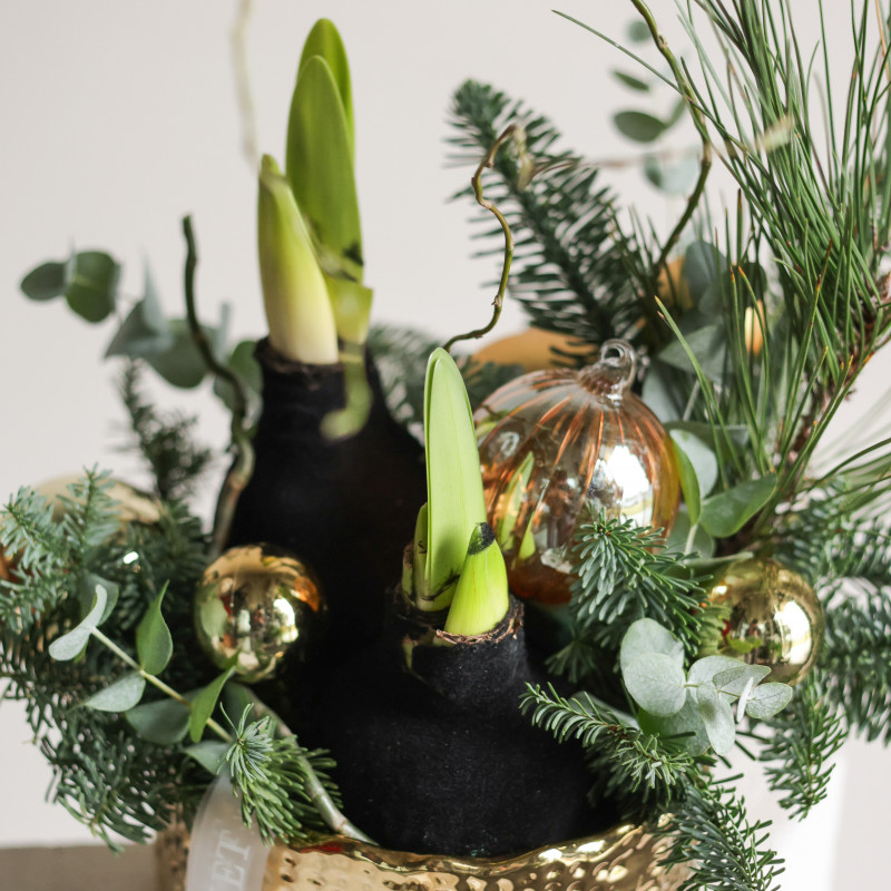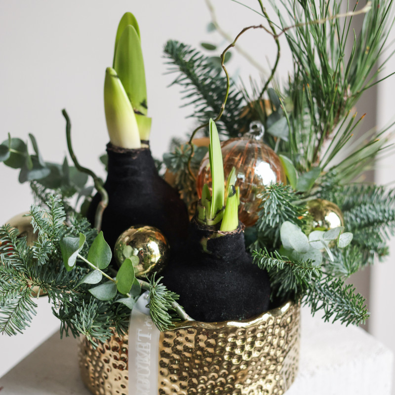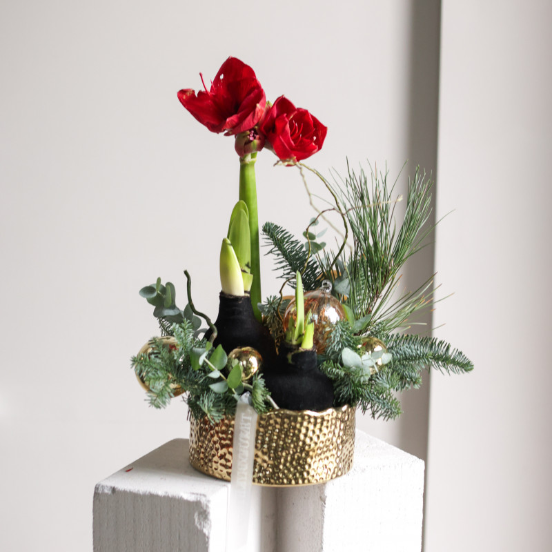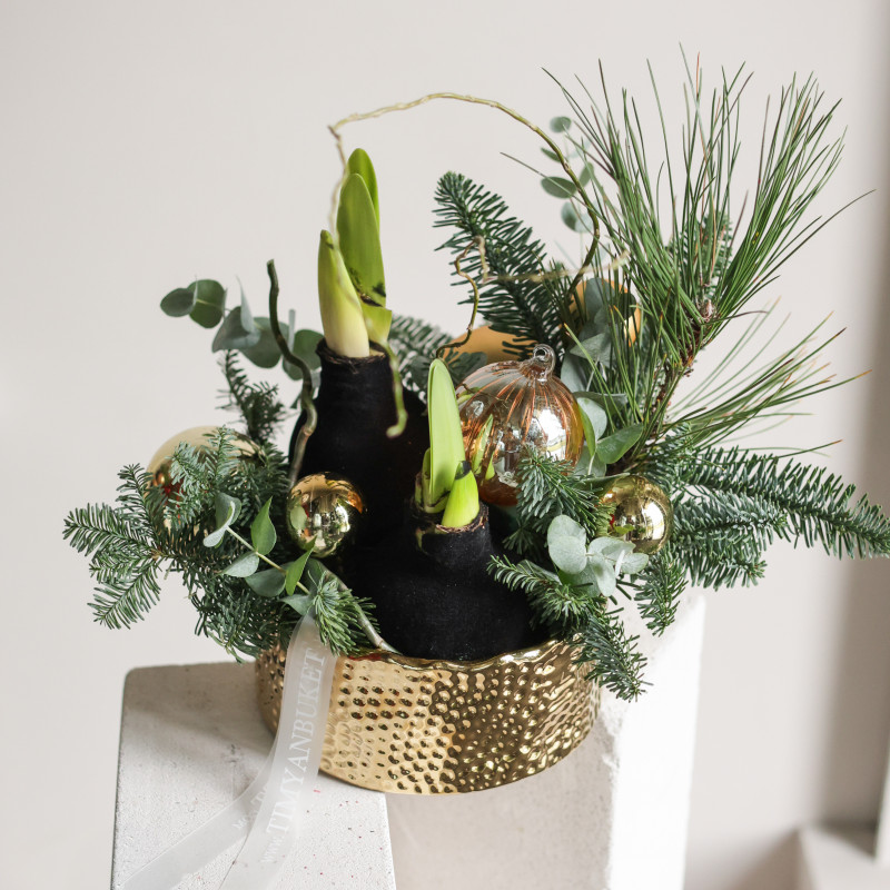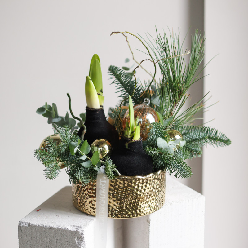 Стильная зимняя композиция в золотом кашпо с тремя луковичными амариллисами в чёрном воске — эффектное, выразительное украшение, в котором сочетаются минимализм и роскошь. Контраст глубокого чёрного воска и тёплого золотого металла создаёт современный премиальный образ. Живая хвоя (пихта, сосна) и веточки эвкалипта добавляют свежести и объёма, а золотые шарики подчёркивают праздничное настроение и делают композицию завершённой.
