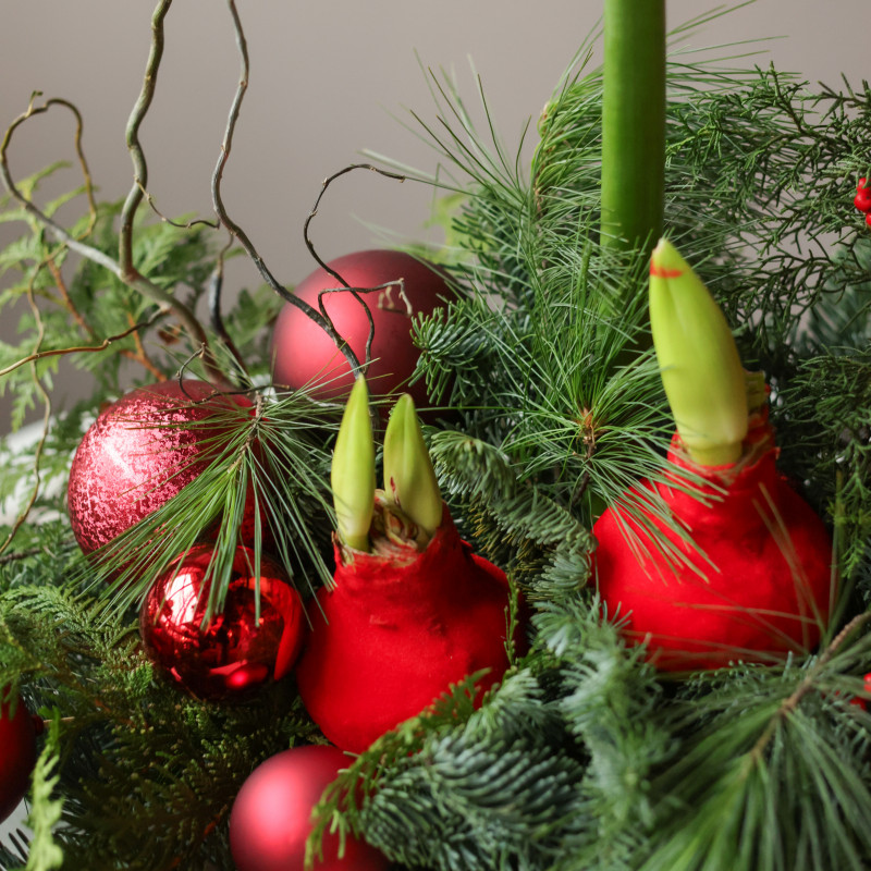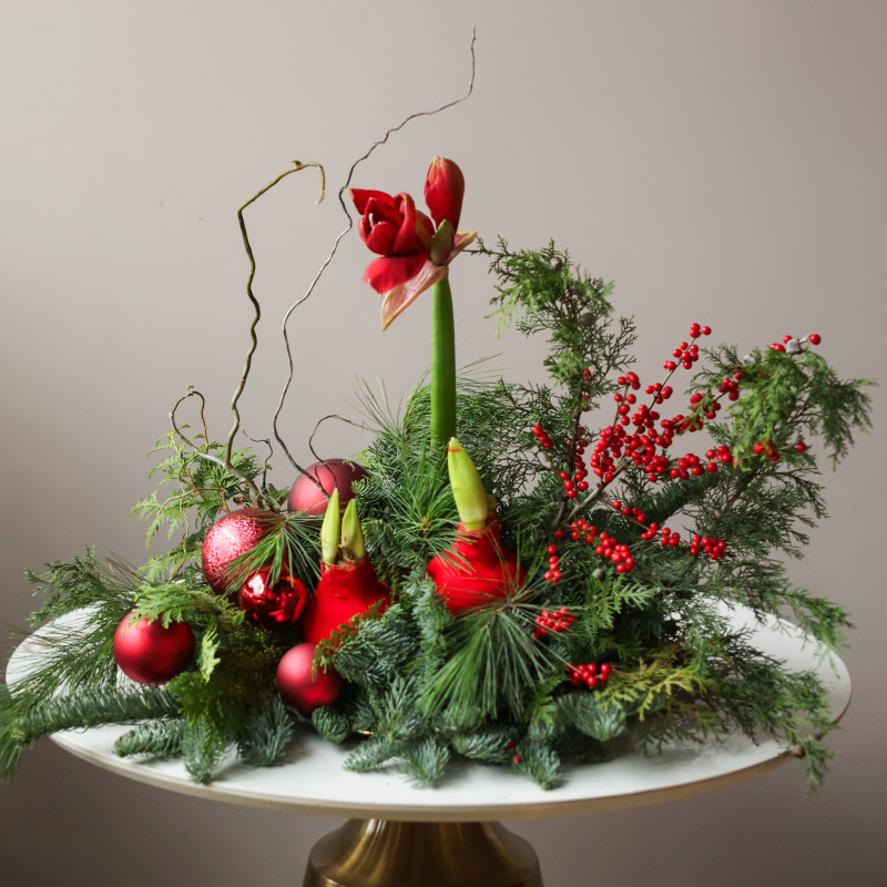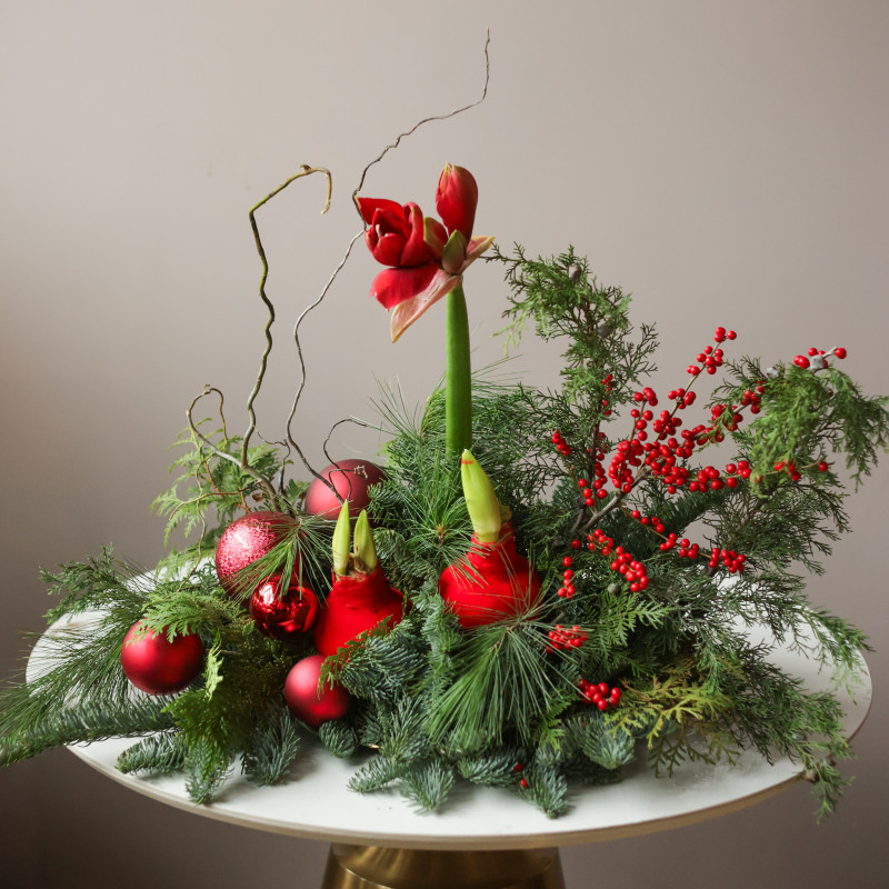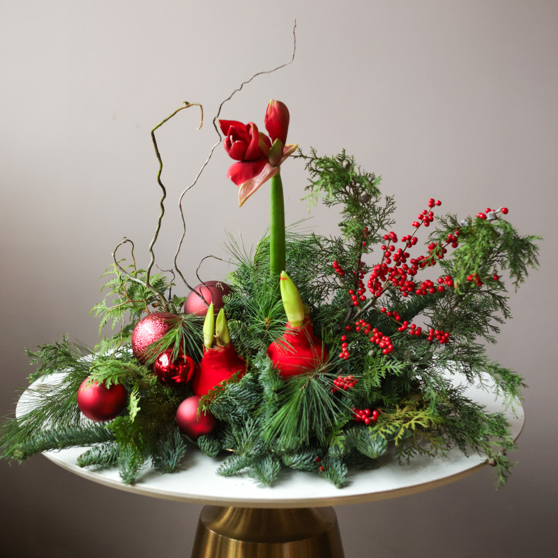 Зимняя композиция на металлическом подносе с тремя луковичными амариллисами в красном воске — яркий, праздничный и очень эффектный акцент для новогоднего интерьера. Луковицы выглядят декоративно уже сами по себе, а по мере роста амариллисы выпускают стрелки и распускают крупные цветы, превращаясь в живую, динамичную деталь пространства. Объёмная хвоя (туя, пихта, сосна), ягоды илекса, декоративные ветки и красные ёлочные шарики создают насыщенный, праздничный, классический рождественский образ.