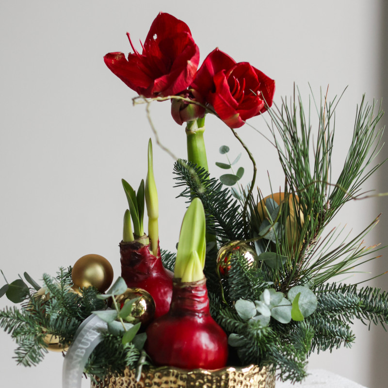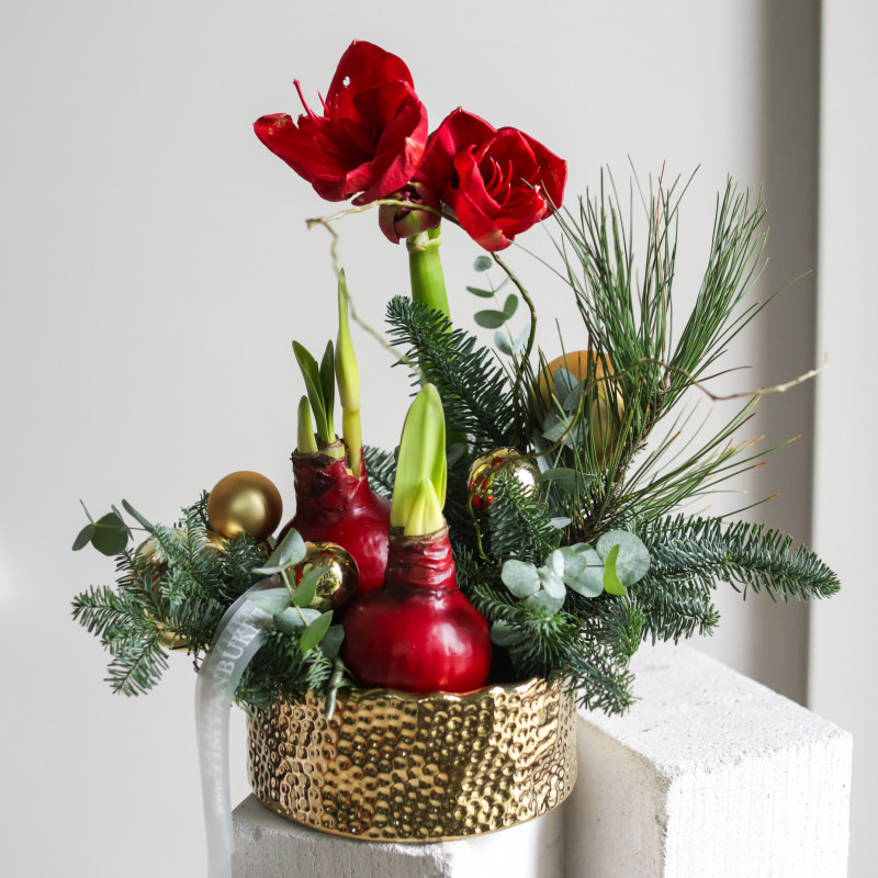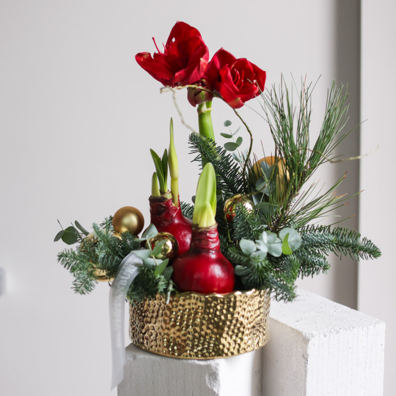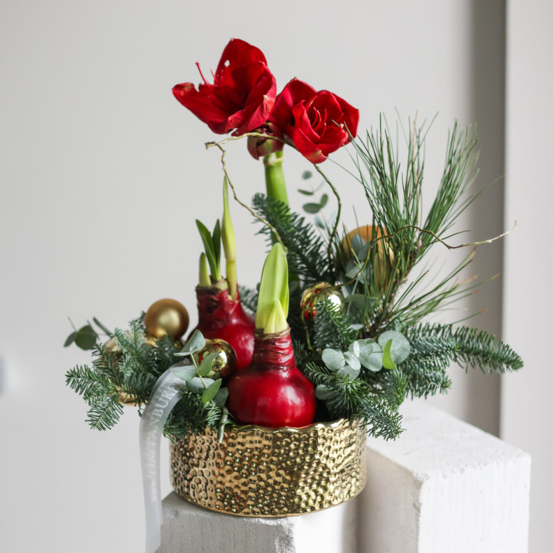 Зимняя композиция в золотом кашпо с тремя луковичными амариллисами в красном воске — яркий, праздничный и очень атмосферный акцент. Глубокий красный цвет воска и тёплый металлический блеск кашпо создают богатое, нарядное впечатление, а сочетание живой хвои (пихта, сосна) и эвкалипта добавляет свежести и объёма. Золотые шарики подчёркивают новогоднее настроение и делают композицию выразительной и завершённой.