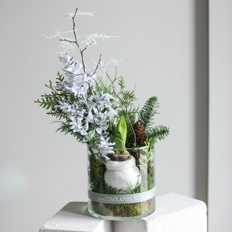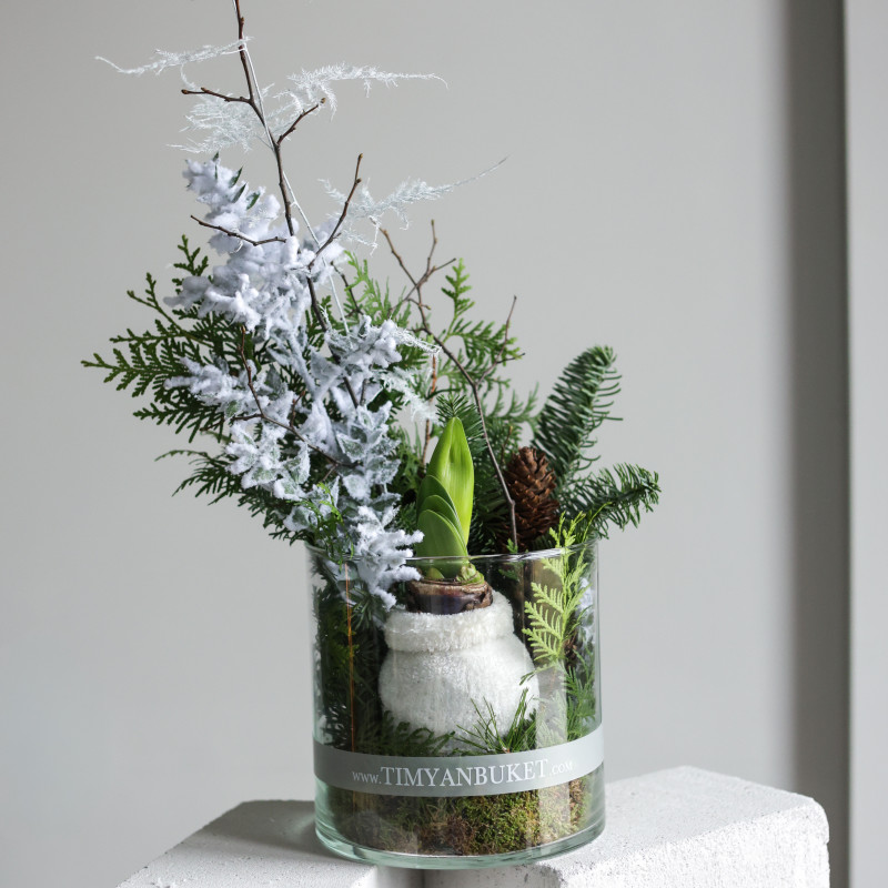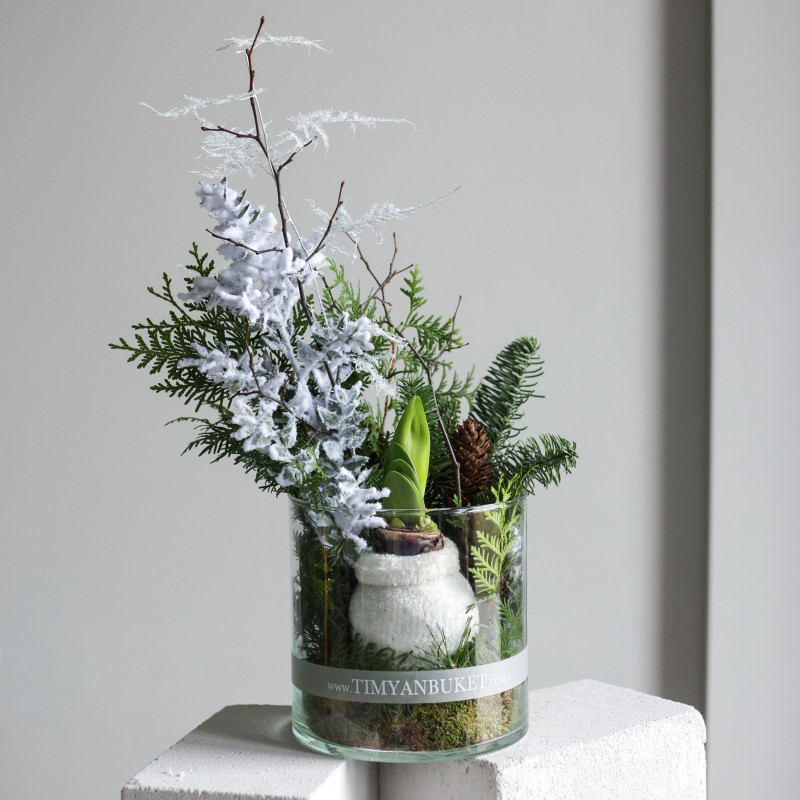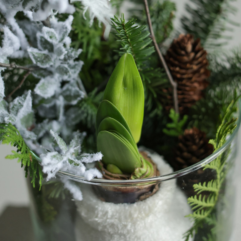 Зимняя композиция в прозрачном стеклянном цилиндре — это аккуратный, уютный акцент, который сразу создаёт атмосферу праздника. Главный герой — луковичный амариллис, «укутанный» в пушистый вязаный чехол-носочек. Он постепенно просыпается, выпускает стрелку и распускает крупные цветы, за которыми можно наблюдать в реальном времени.