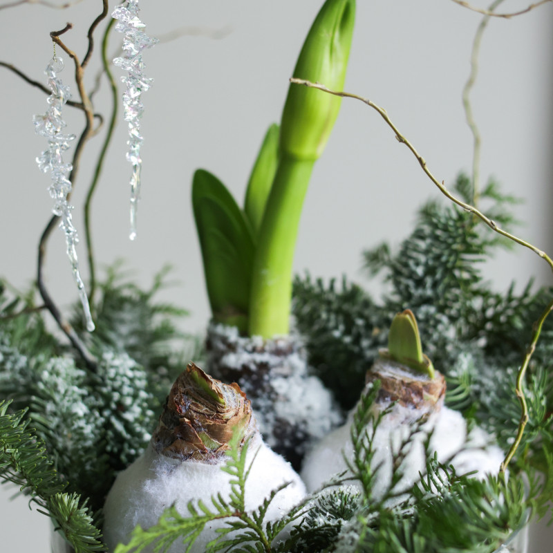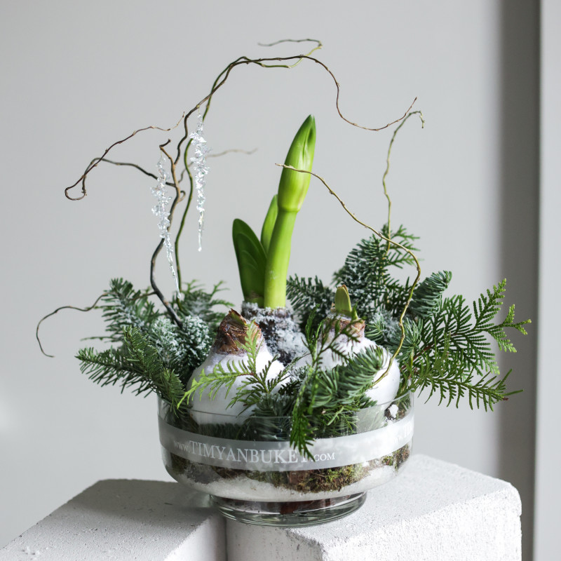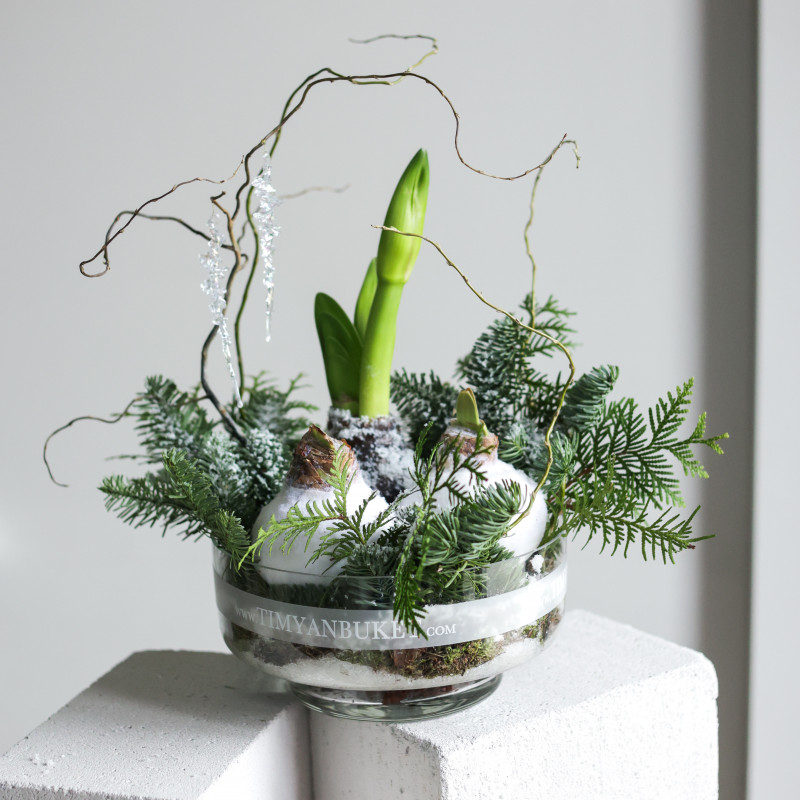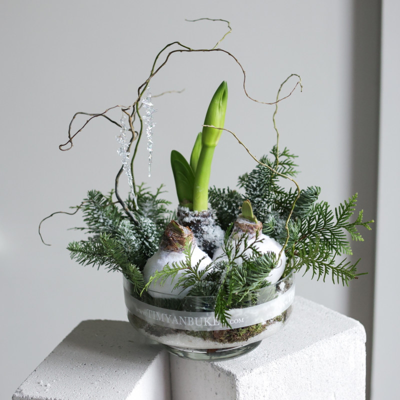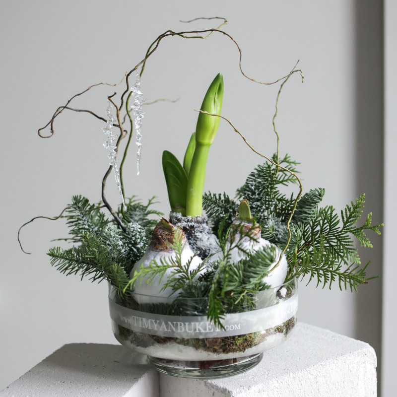 Зимняя композиция в прозрачной стеклянной низкой вазе с тремя луковичными амариллисами — масштабный, выразительный и праздничный акцент для интерьера. Луковицы амариллисов украшены воском и лёгким «снежным» покрытием, благодаря чему композиция выглядит эффектно даже до начала цветения. Амариллисы постепенно просыпаются, выпускают стрелки и раскрывают крупные цветы, превращаясь в живую, меняющуюся декорацию. Образ дополняют мох, ветки туи, декоративные зимние ветки и изящные сосульки, создавая атмосферу настоящей зимней сказки.
