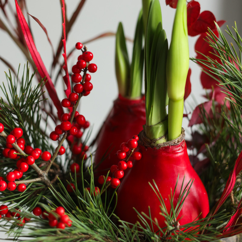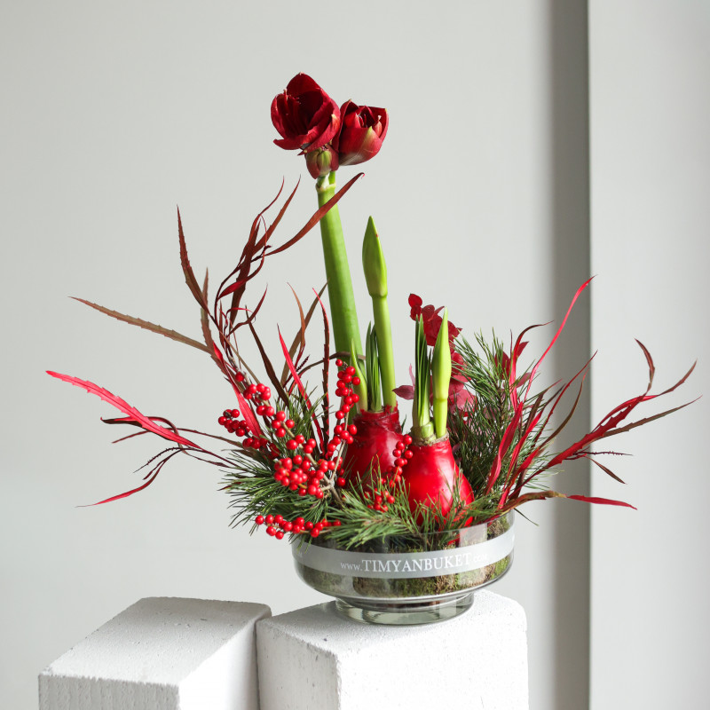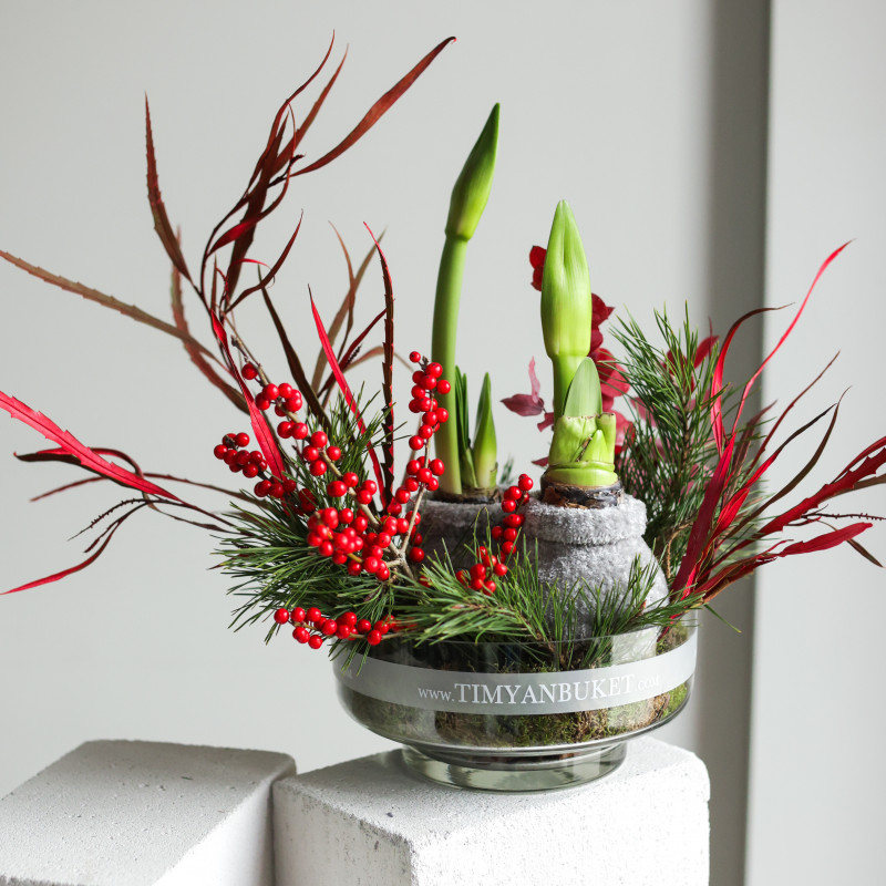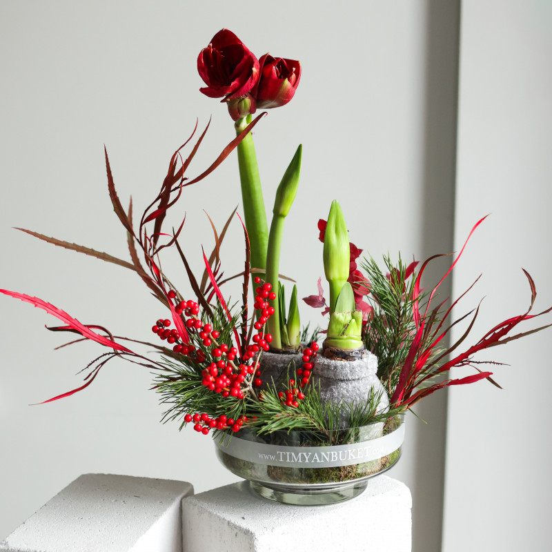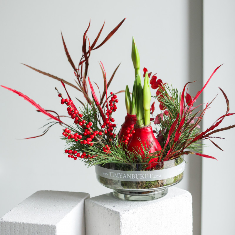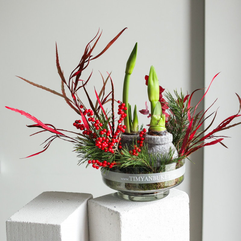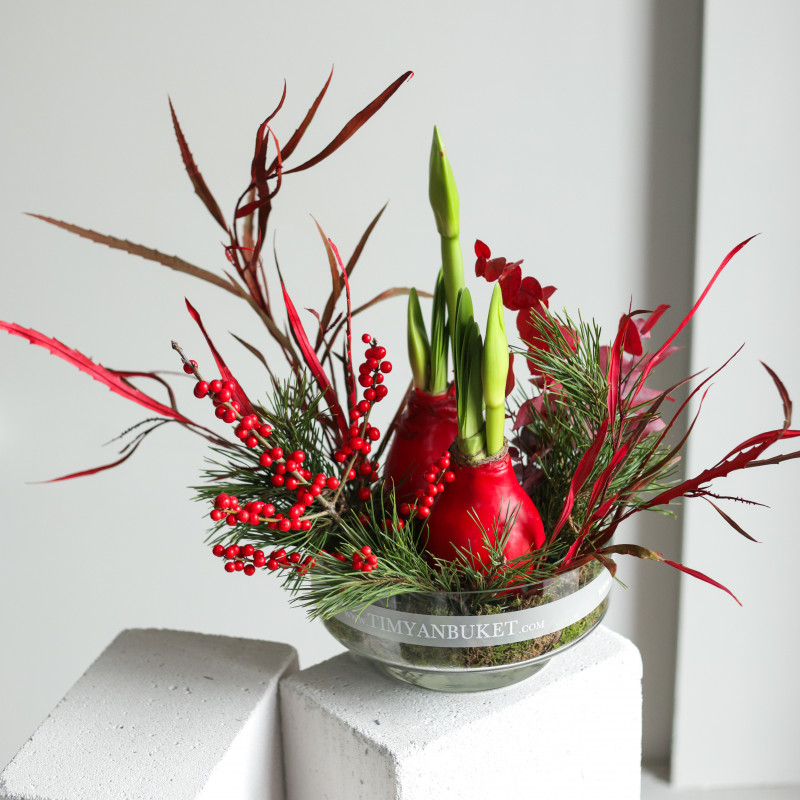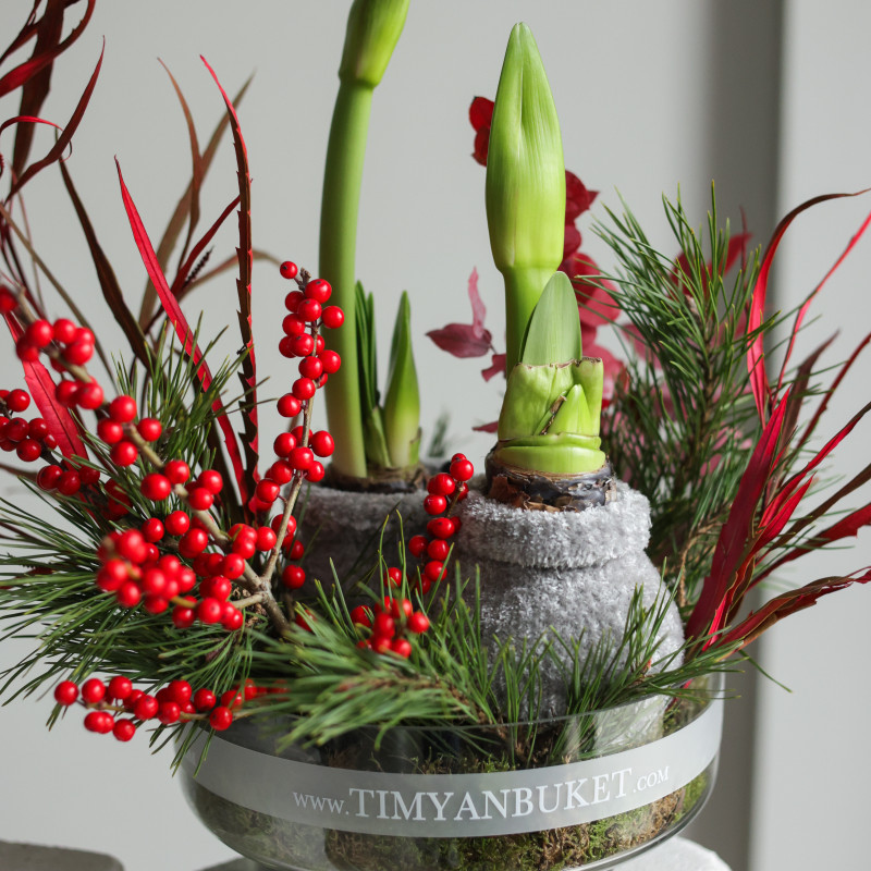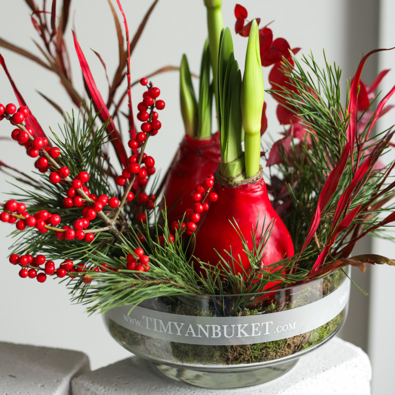 Зимняя композиция в прозрачной стеклянной низкой вазе с двумя луковичными амариллисами — насыщенный, выразительный акцент, который сразу создаёт праздничное настроение. Луковицы представлены в ассортименте: в вязаном «носочке» или в красном воске. Амариллисы постепенно просыпаются, выпускают стрелки и раскрывают крупные цветы, создавая ощущение живого, постоянно изменяющегося декора. Мох, свежая хвоя, декоративные ветки, крашеный эвкалипт и яркая ветка илекса формируют объёмную, атмосферную композицию, которая отлично смотрится в интерьере и прекрасно подходит для подарка.