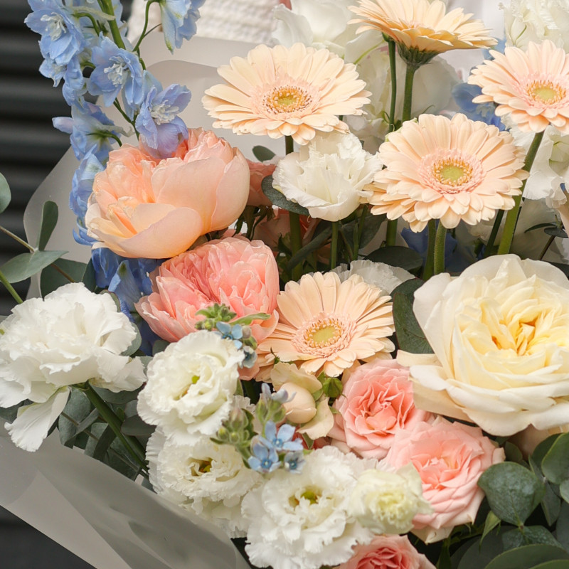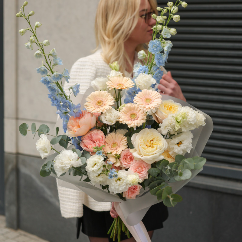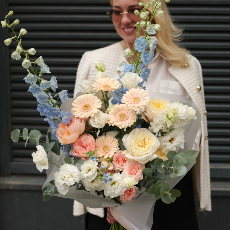 Авторский букет с дельфиниумом, герберами и пионовидными розами