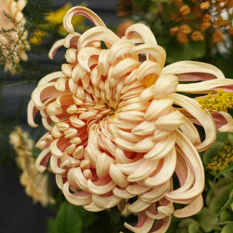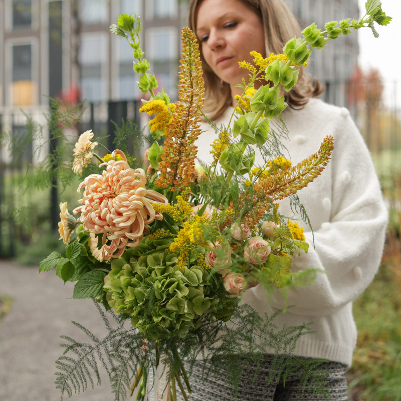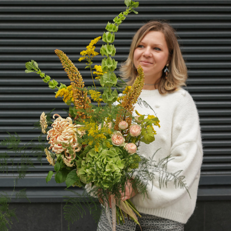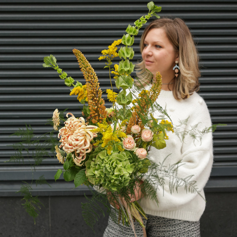Авторский букет без упаковки — динамичный, фактурный, созданный в лучших традициях современной флористики. Высокие линии эремуруса придают композиции выразительность и движение, молюцелла добавляет свежести и зелёного объёма, а герберы и хризантемы Кудри создают игру текстур и оттенков. Зелёная гортензия и декоративная зелень связывают всё воедино, наполняя букет ощущением естественности, баланса и лёгкого шика. Такой букет станет эффектным подарком для тех, кто ценит стиль и оригинальность.