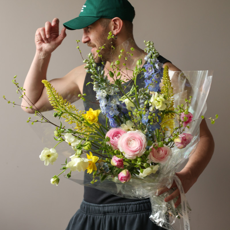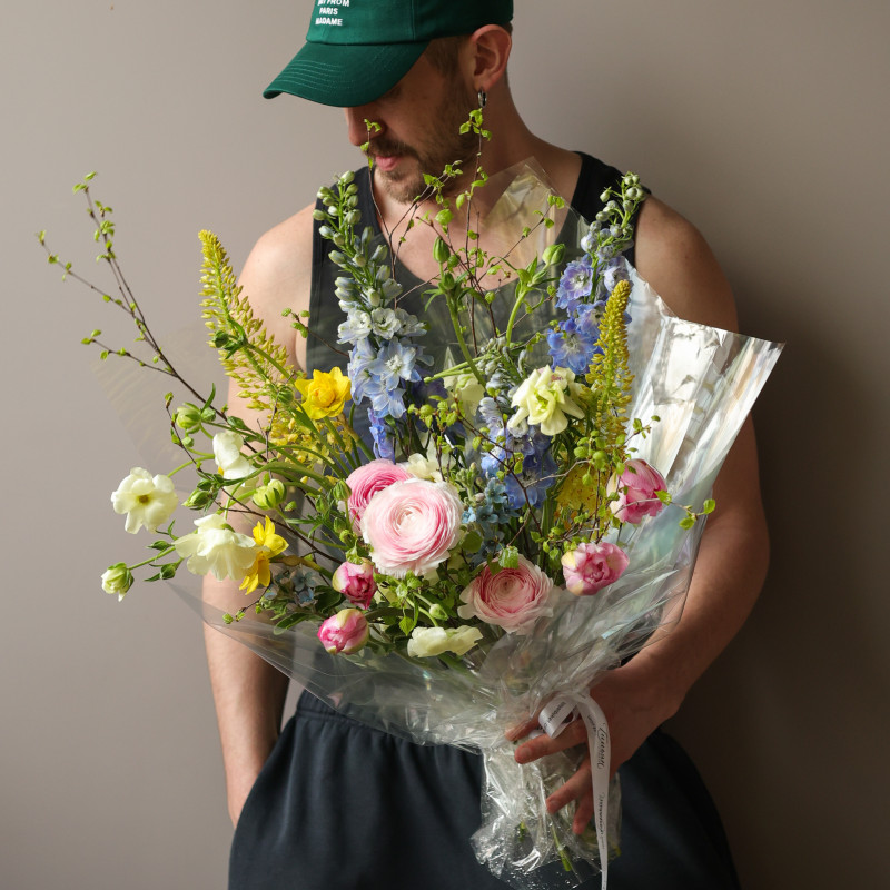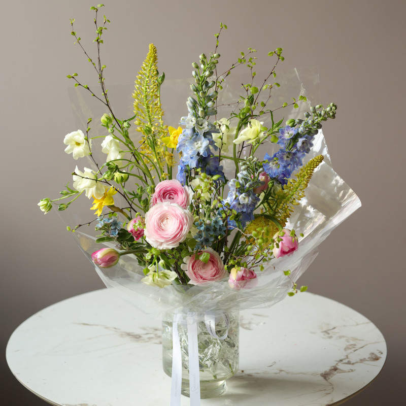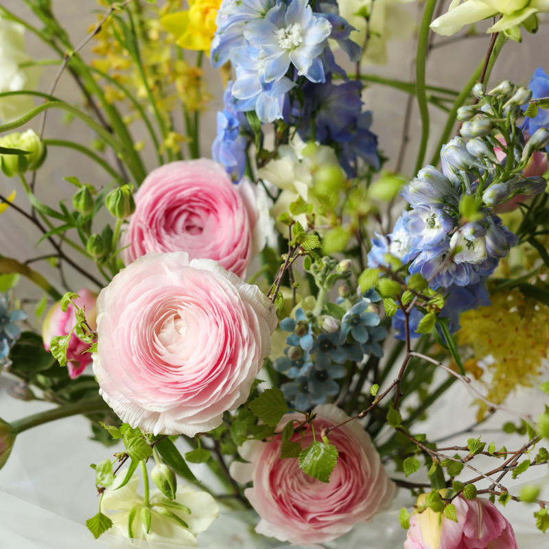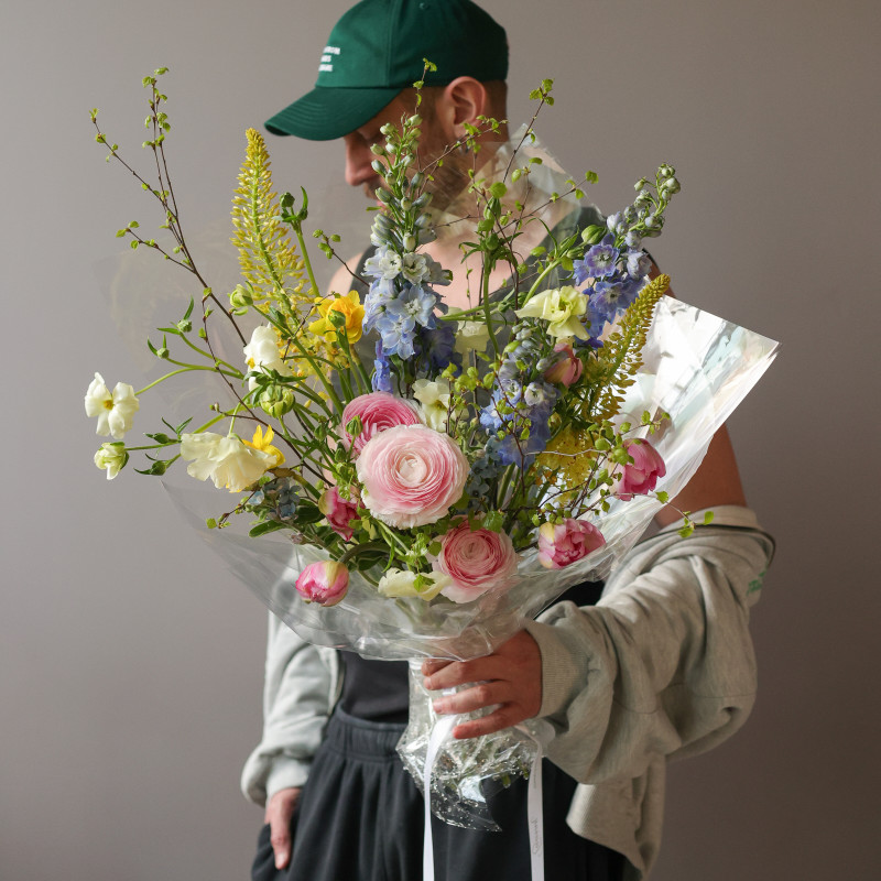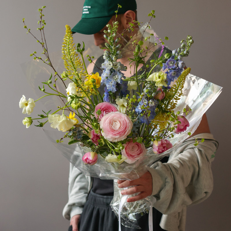 Авторский букет в нежной гамме с ранункулюсами и дельфиниумом