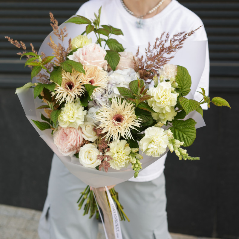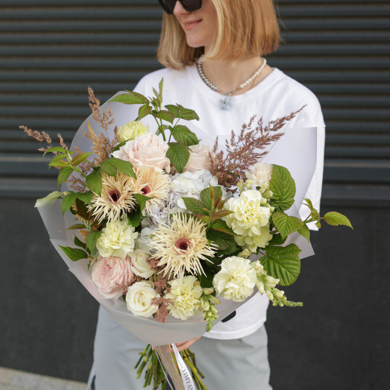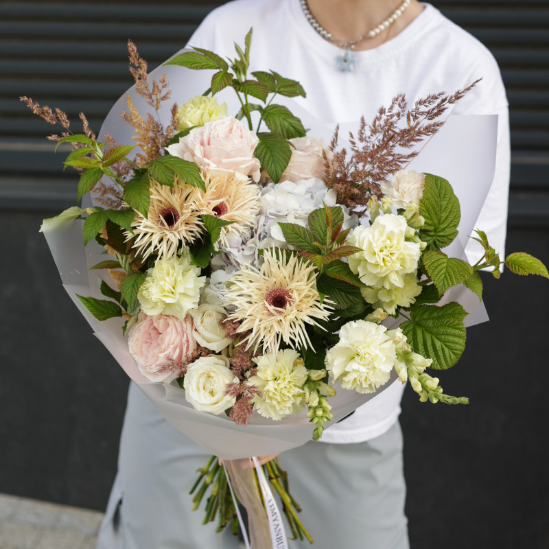 Состав: гербера игольчатая, гортензия, диантус, роза, поиновидные роза, ветви малины, декоративная зелень