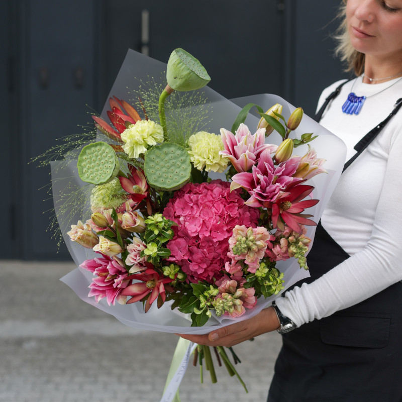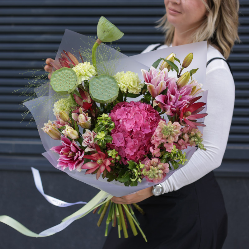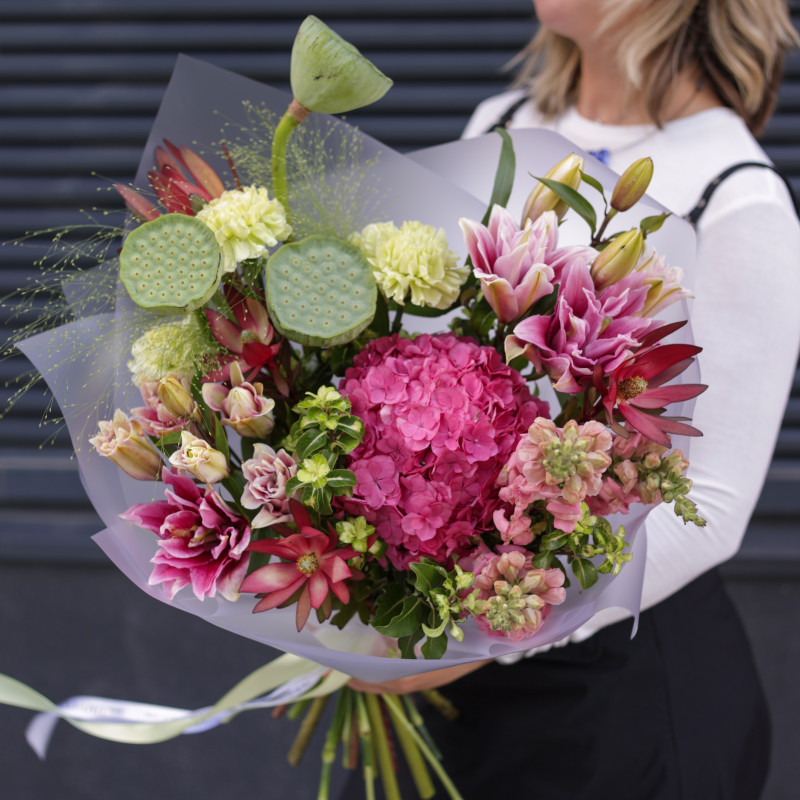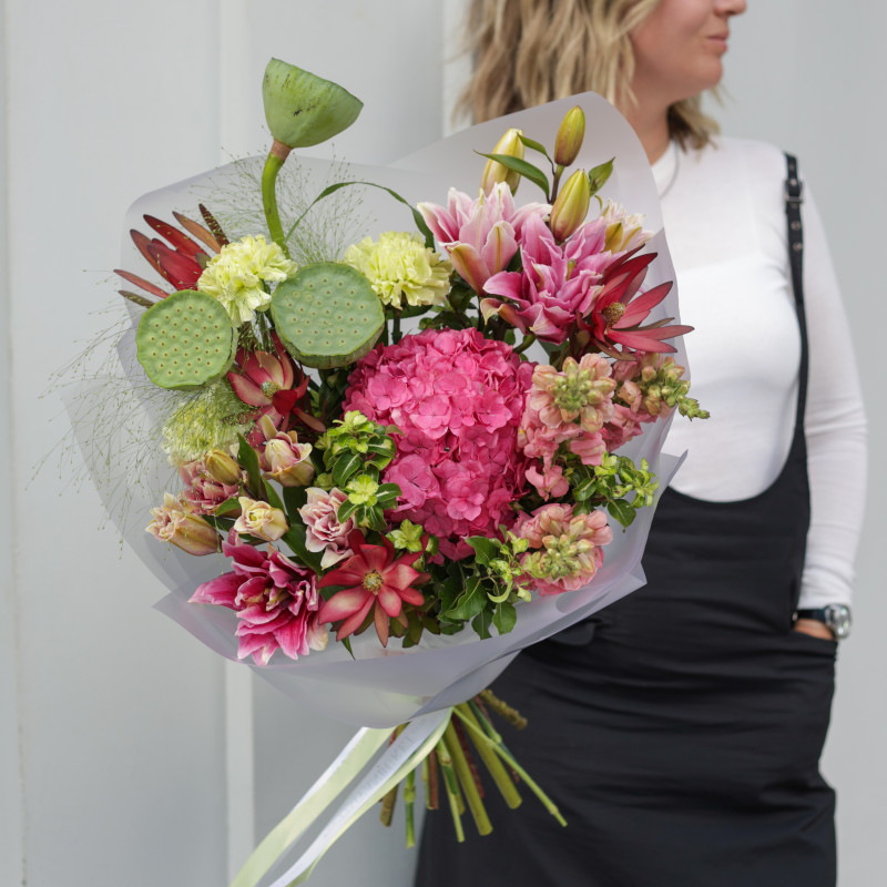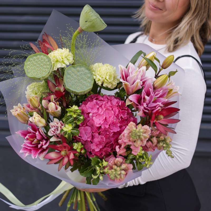 арт. 5932Состав: плоды лотоса, гортензия, диантус, маттиола, лилии, декоративная зелень.