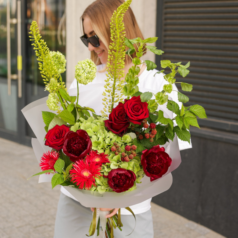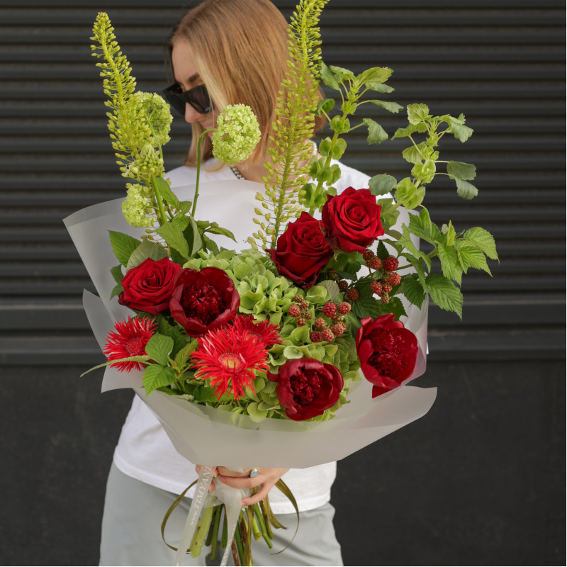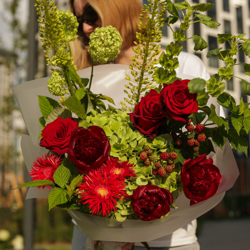 арт. 5897Состав: зеленая гортензия, винные розы, пионы, игольчатые герберы, декоративная зелень.