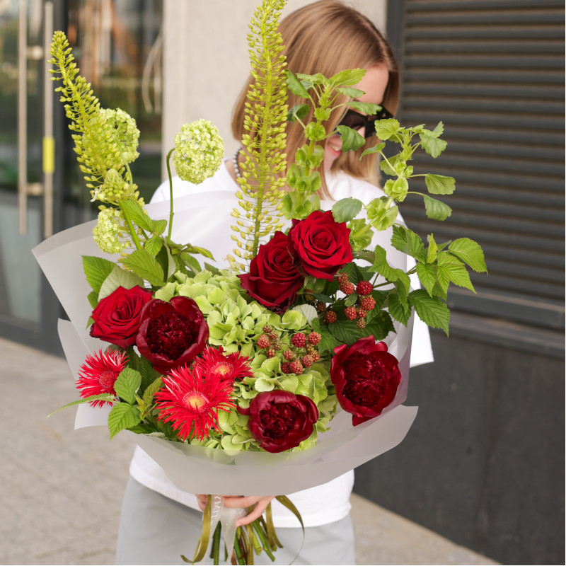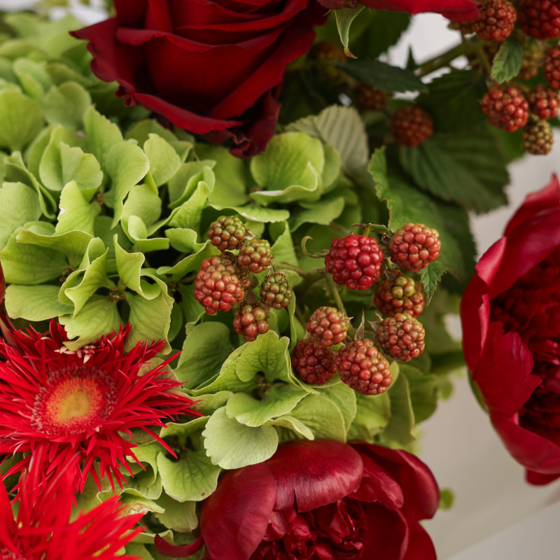Букет авторский с винными розами, зеленой гортензией и ягодами ежевики