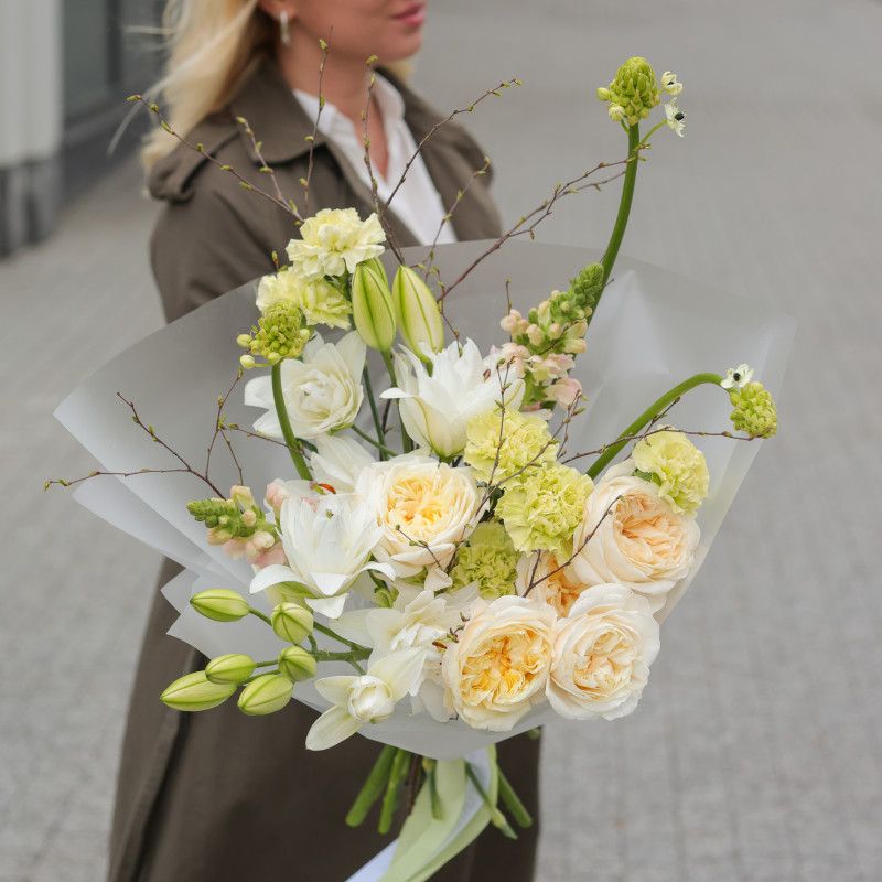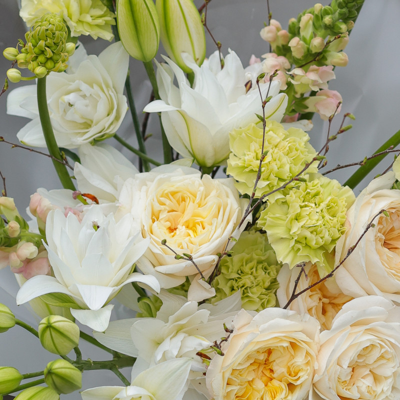 Букет с дельфиниумом, пионовидными лилиями и пионовидными розами
