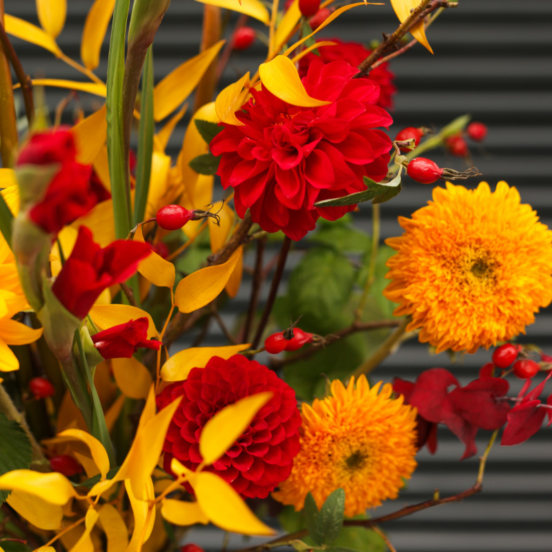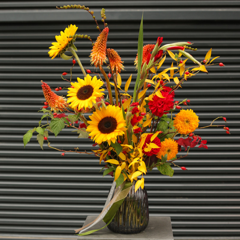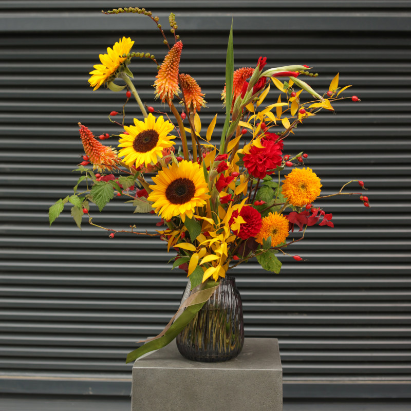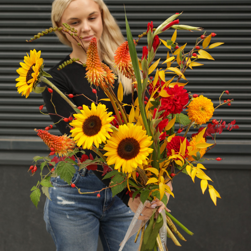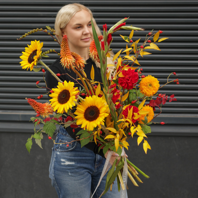 Состав: подсолнухи, книфофия, гладиолус, георгин, декоративная зелень.
