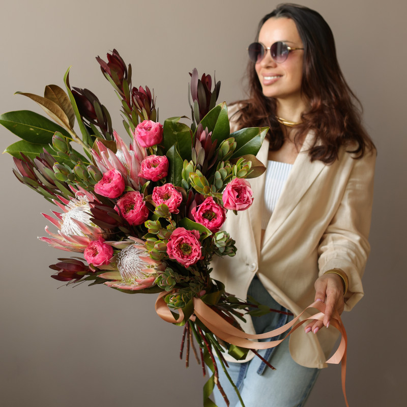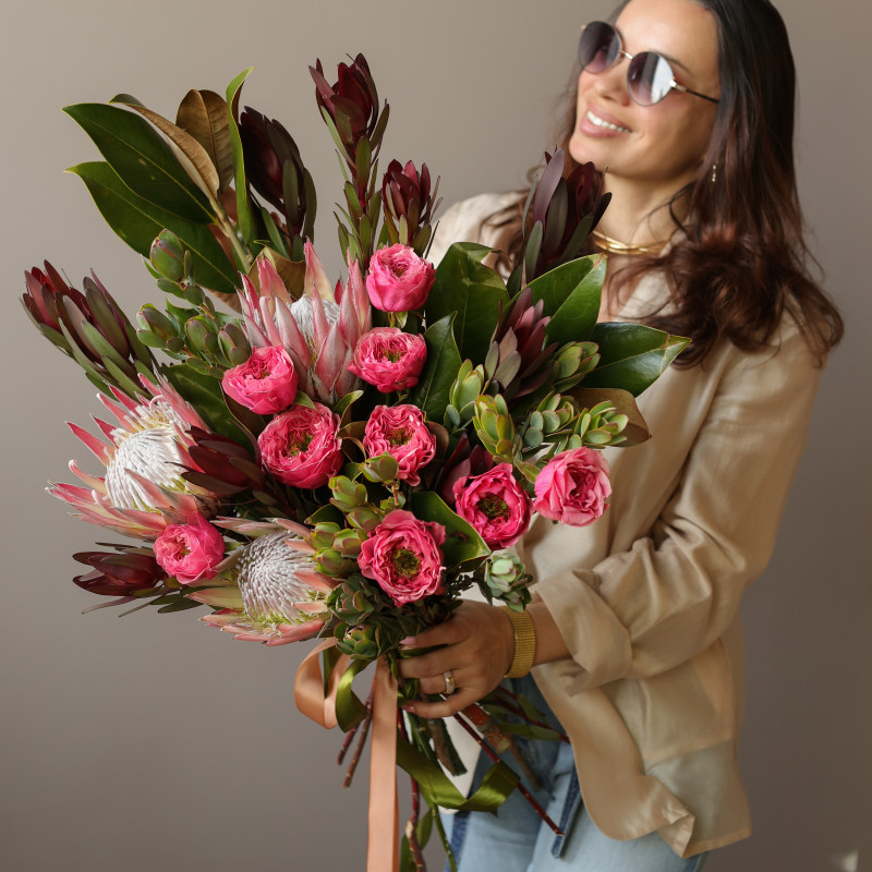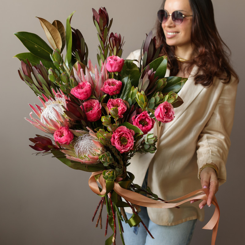 Букет с сильным характером с пионовидными розами и протеей — выразительный, фактурный и уверенный. Пионовидные розы с зелёной серединкой добавляют глубину и необычный акцент, протея задаёт мощный центр композиции и подчёркивает её брутальность. Декоративная зелень усиливает природную эстетику и делает букет собранным и цельным. Отсутствие упаковки подчёркивает честность формы и стиль. Идеален как подарок мужчине или как выразительный жест с характером.