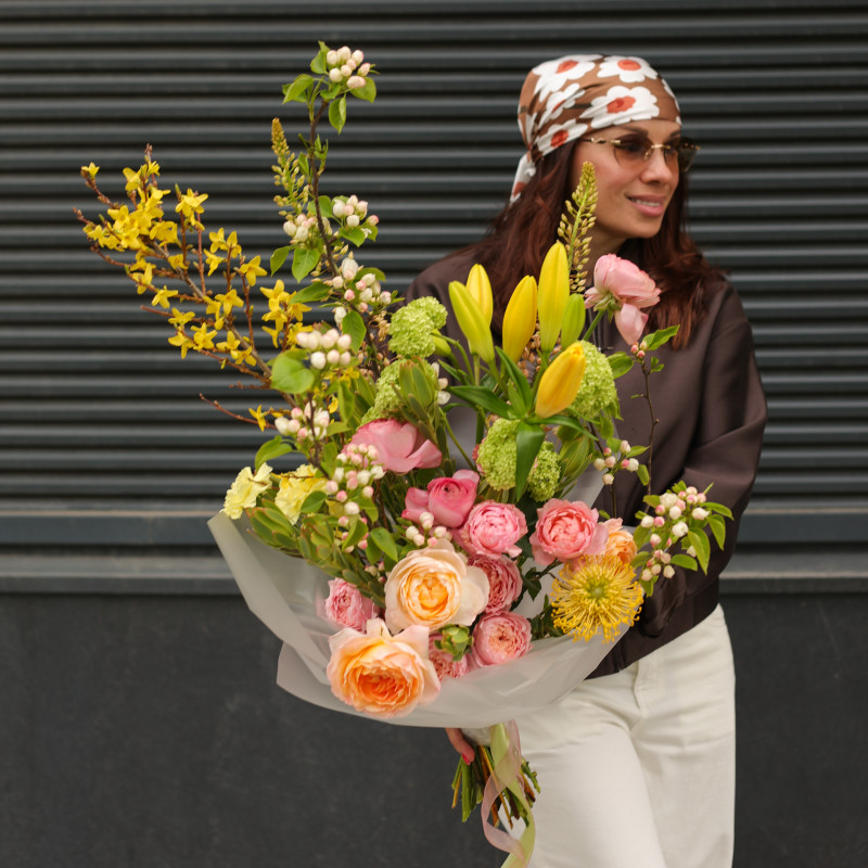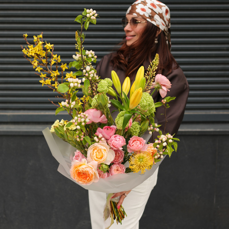 Букет яркий с миксом пионовидных роз, лилиями и цветущими ветками