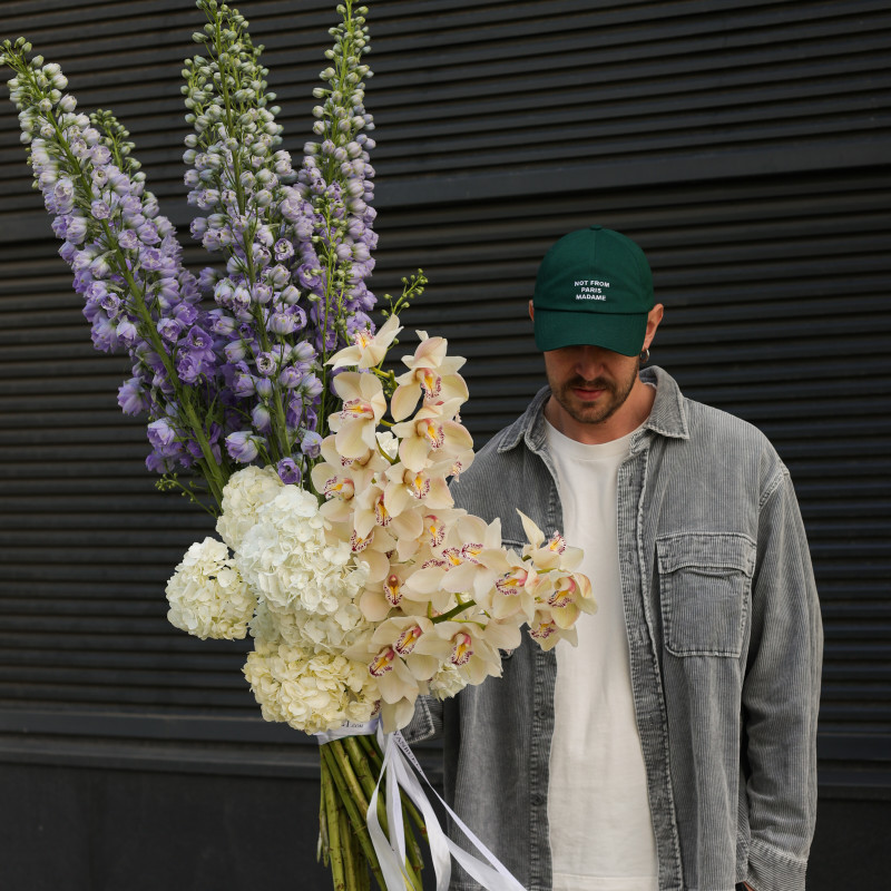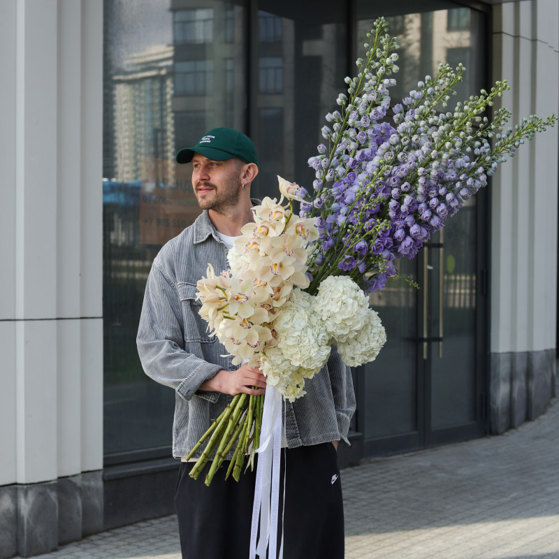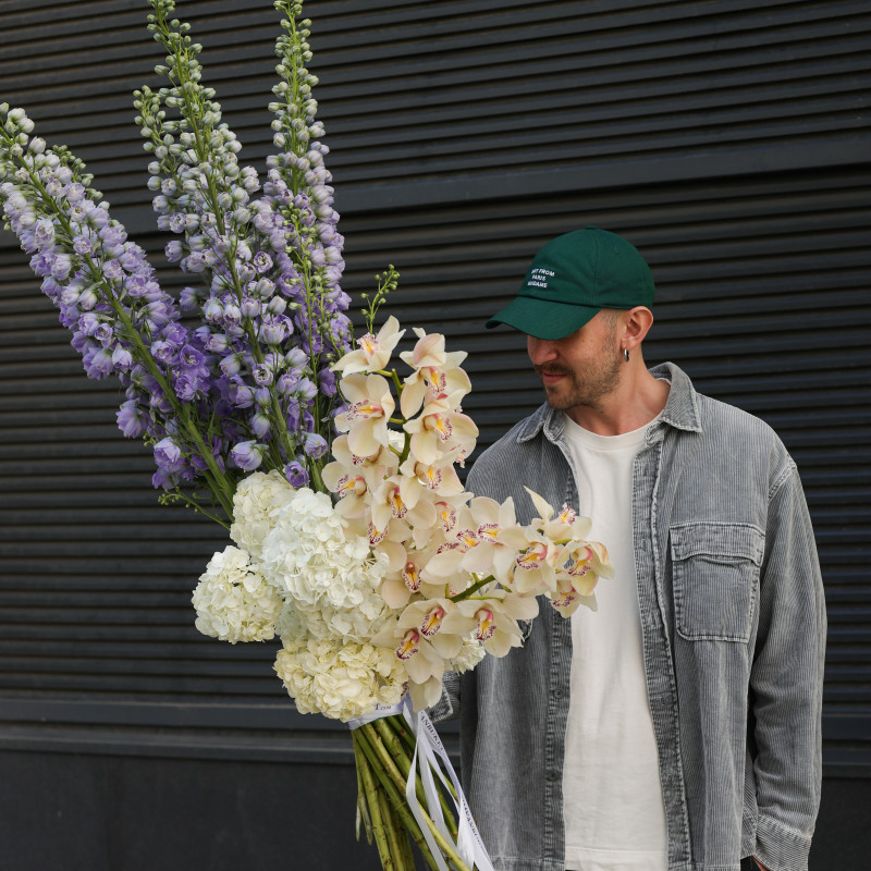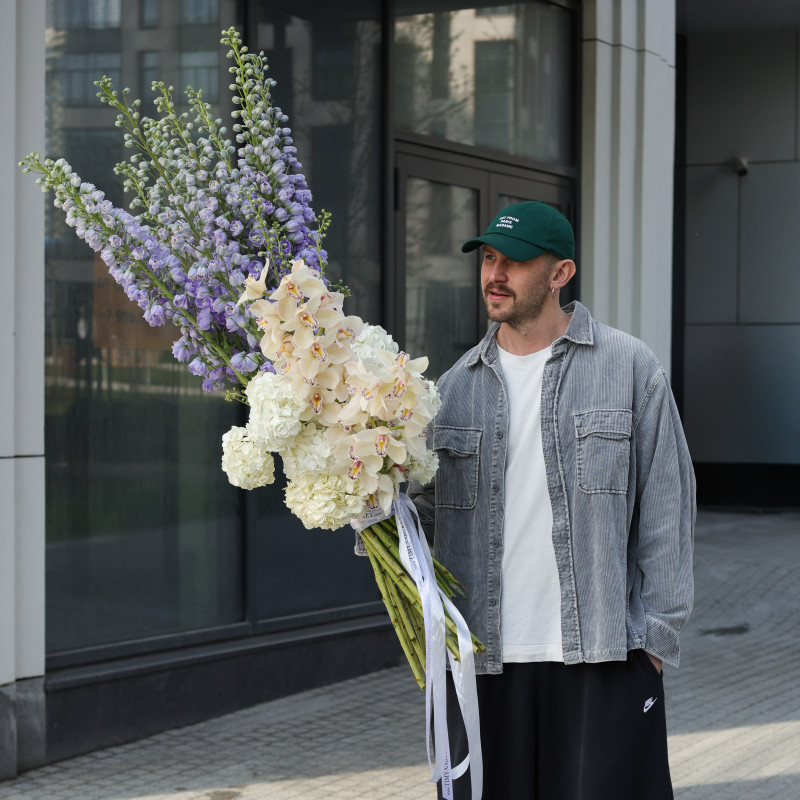 Выразительный букет с дельфиниумом, орхидеей и гортензией