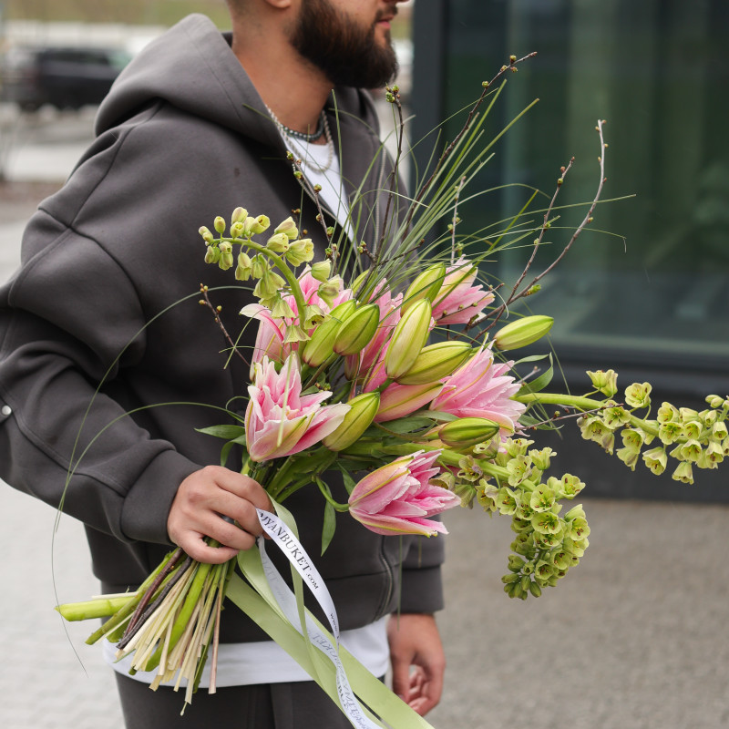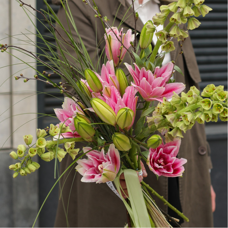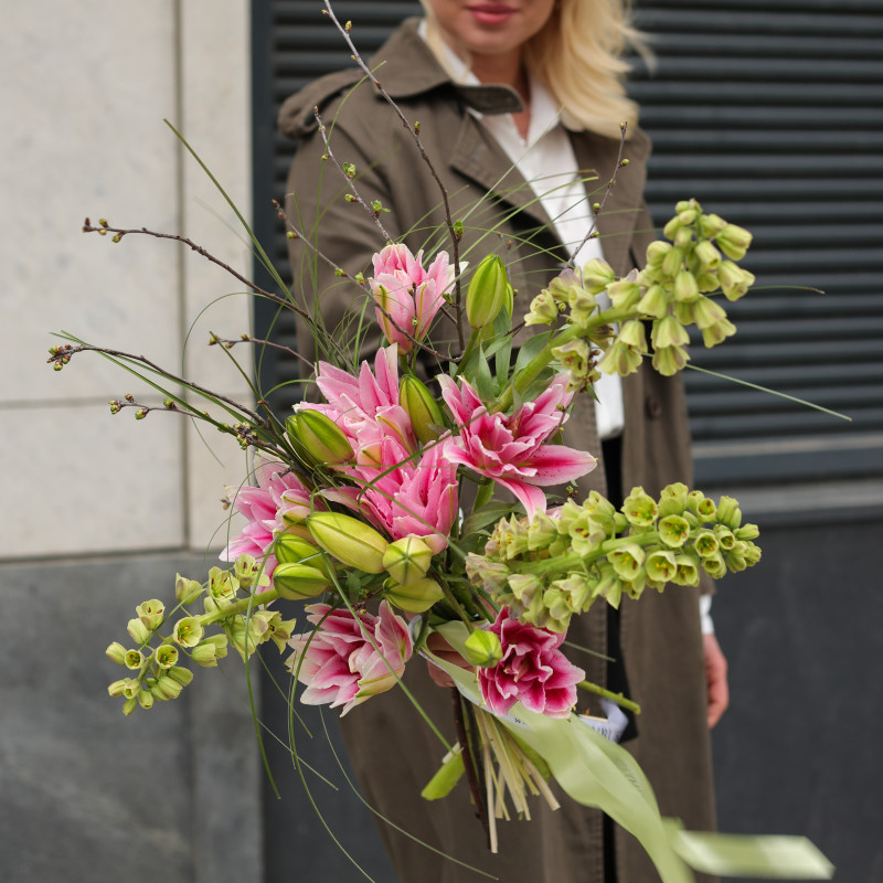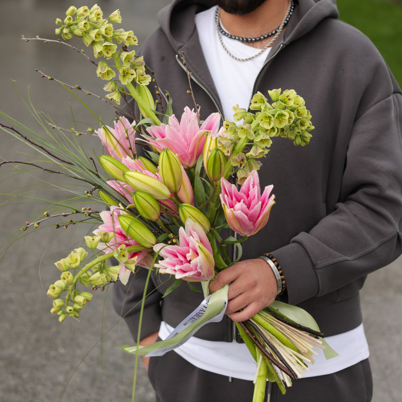 Букет без упаковки с пионовидными лилиями и фритиллярией