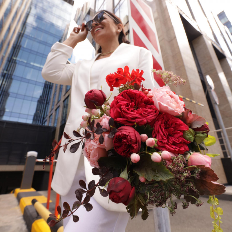 Сочетание изысканных бархатных пионов, пионовидных роз и акцентной зелени дают современное и стильное звучание образу невесты.