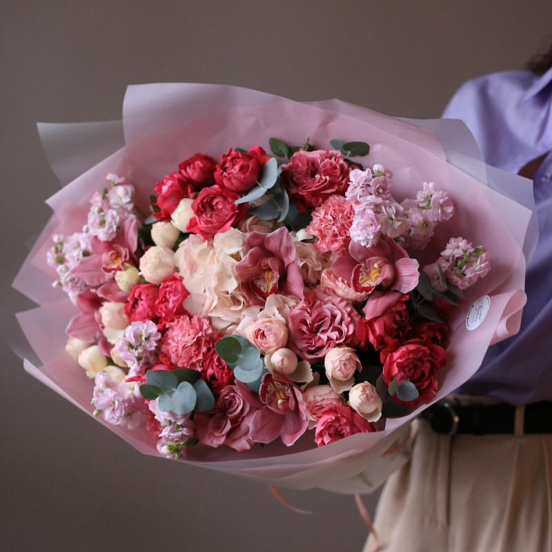 Сочный пленительный весенний букет с розами, гортензией, орхидеями, маттиолой и эвкалиптом!