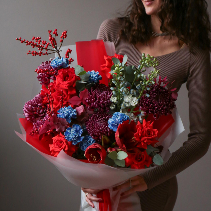Необычный букет с алыми розами, винными хризантемами и небесно-голубыми диантусами – это сочетание страсти, утонченности и свежести. Яркие алые розы и амариллисы символизируют любовь и пылкие эмоции, винные хризантемы добавляют глубину и изысканность, а небесно-голубые диантусы привносят неожиданный и свежий акцент, делая композицию уникальной и запоминающейся. Такой букет станет идеальным подарком на день рождения, годовщину, праздник или просто для того, чтобы порадовать дорогого человека и выразить свои искренние чувства.