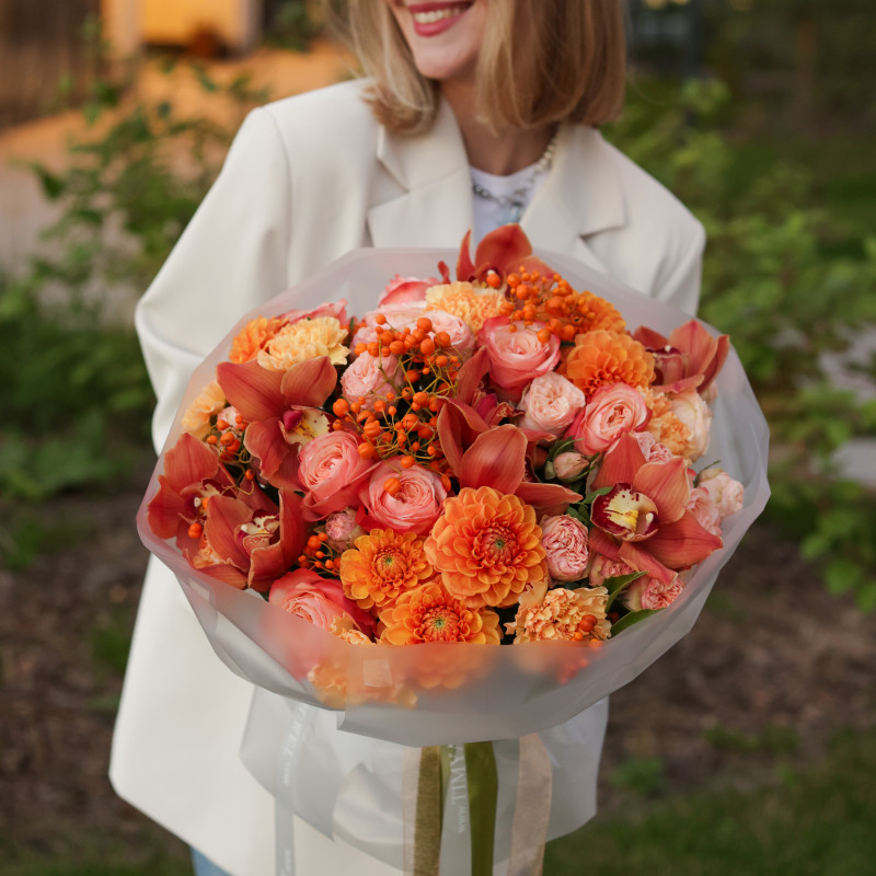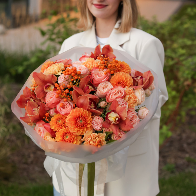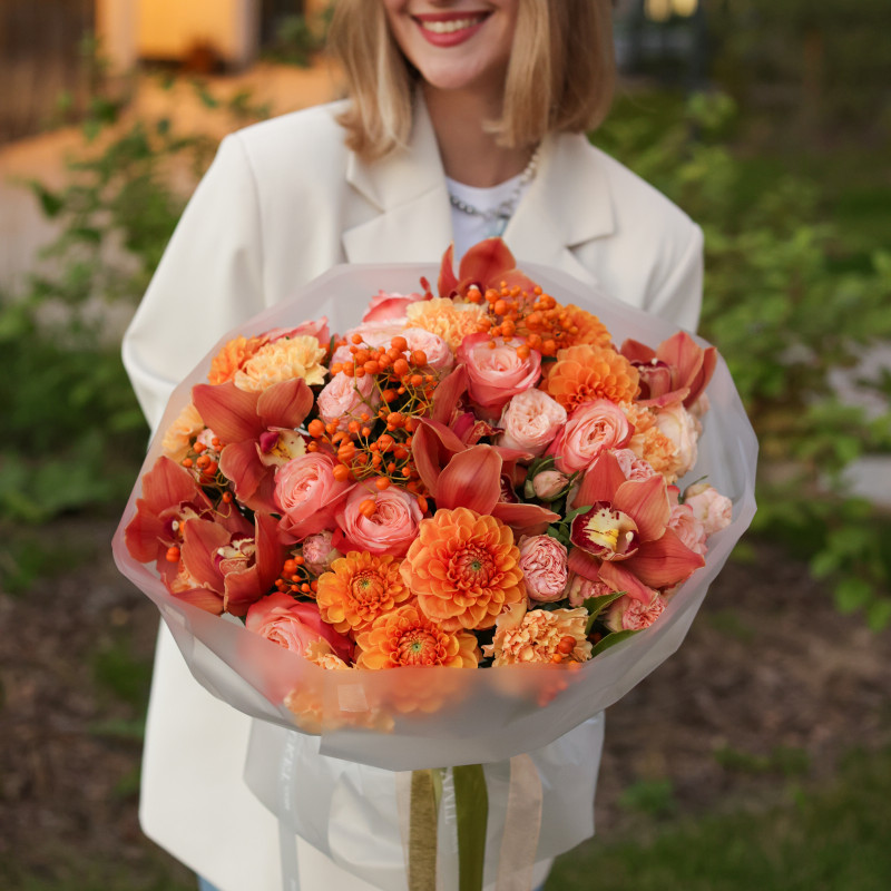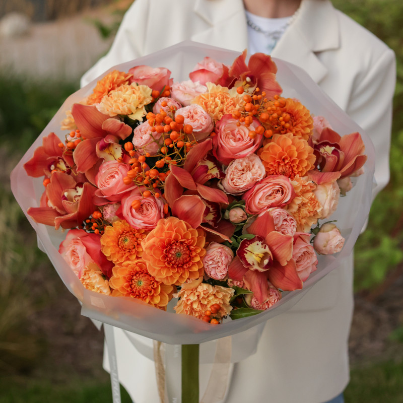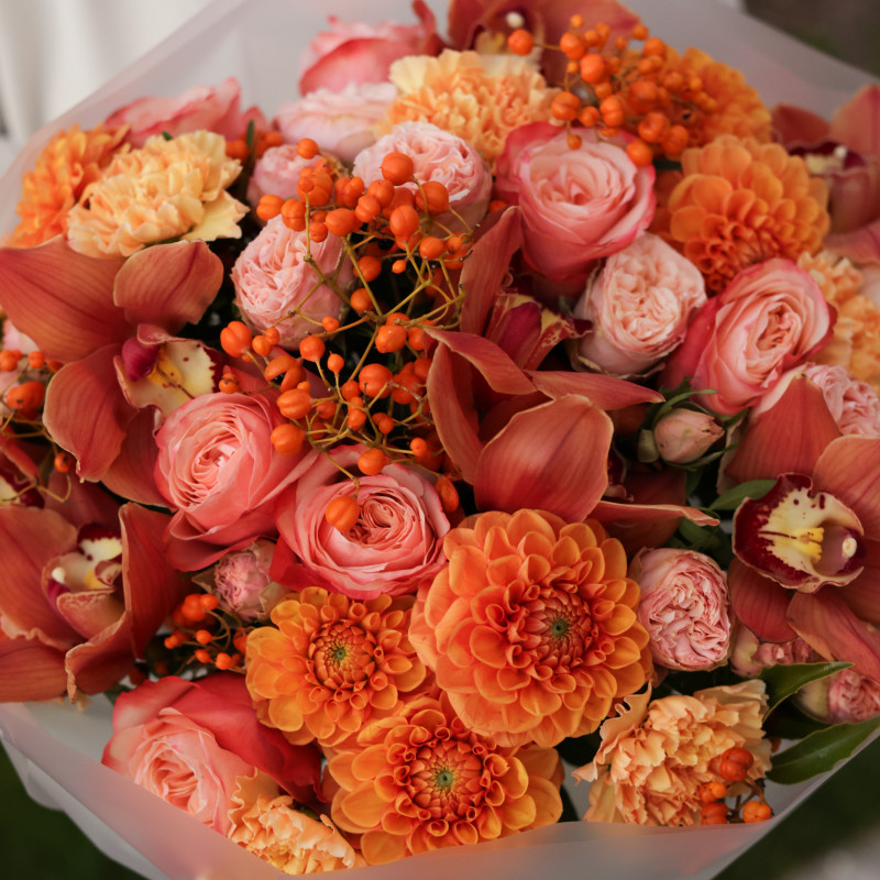 Состав: карамельные орхидеи, георгины, пионовидные розы, диантус, кустовые розы, декоративные ягодки.