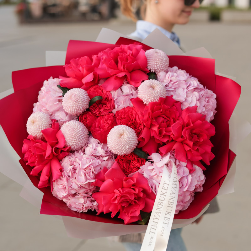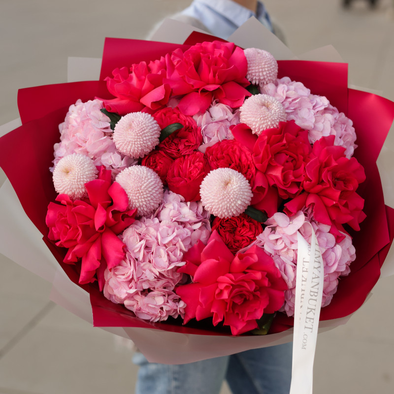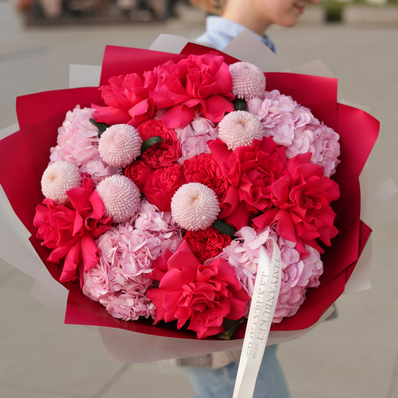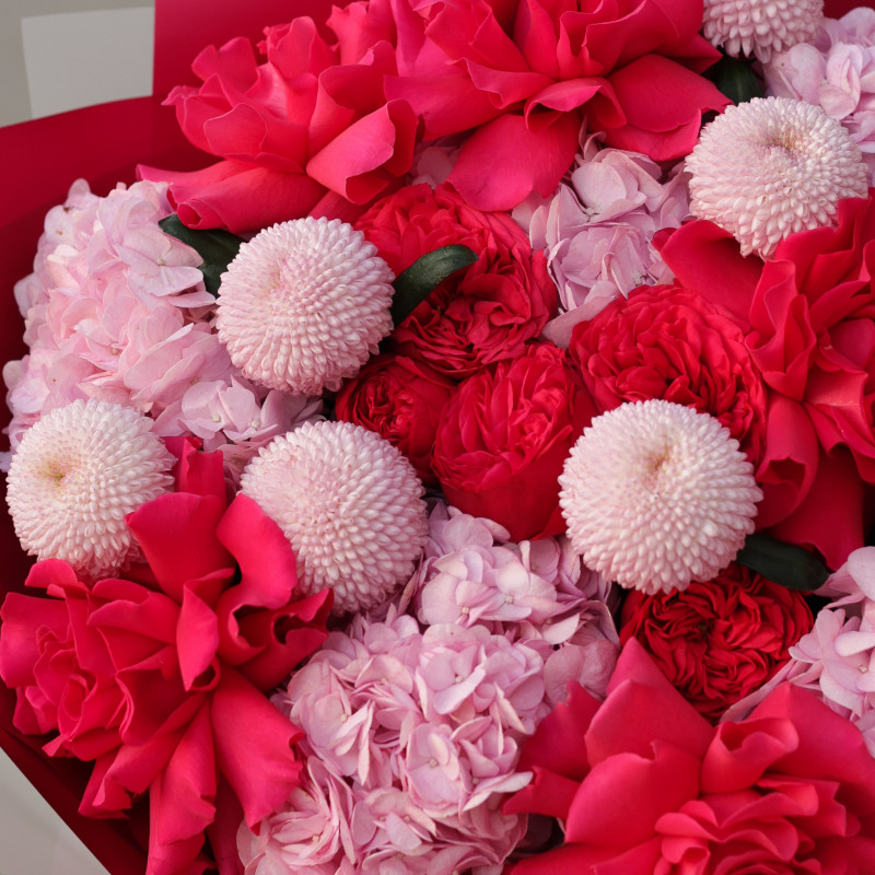 Состав: красные французские розы, красные пионовидные розы, розовые хризантемы, розовая гортензия, декоративная зелень.