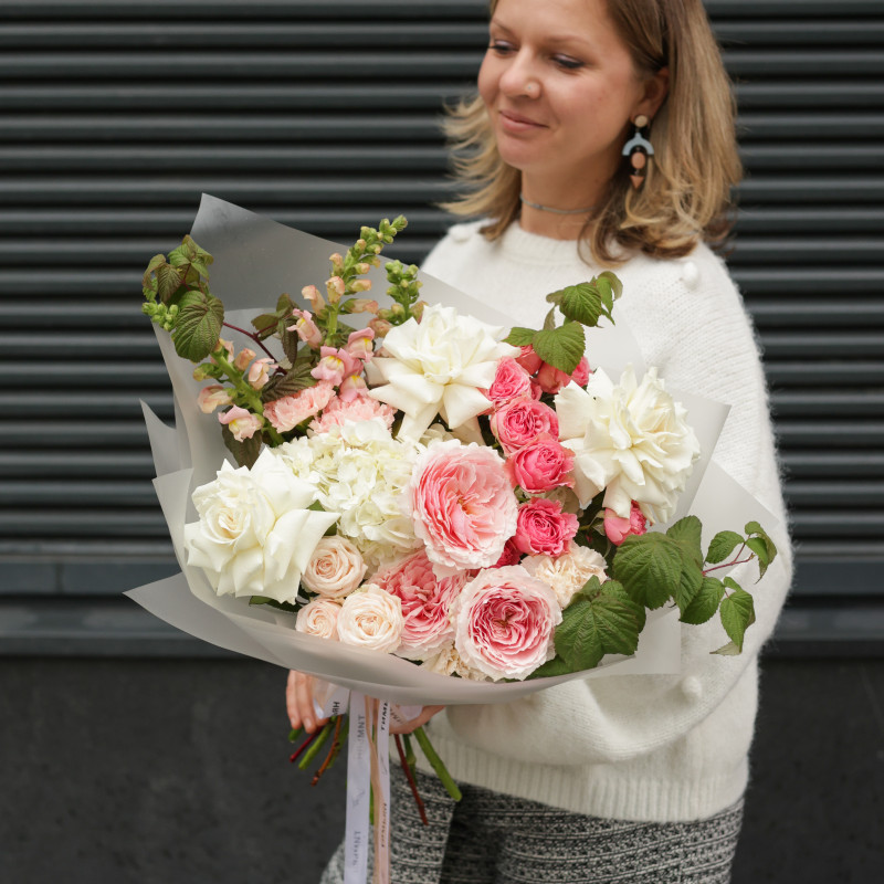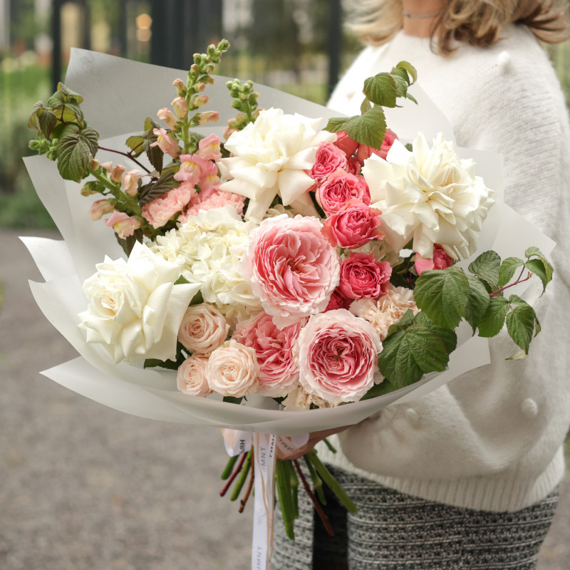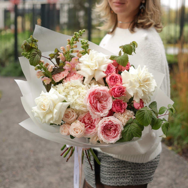 Нежный букет, собранный в полупрозрачную плёнку и перевязанный лентами, словно дыхание утреннего света. Микс пионовидных розовых роз раскрывается мягкими волнами лепестков, белые французские розы придают изящество, а антириум добавляет архитектурности и динамики. Ветки малины завершают композицию лёгким природным акцентом, создавая впечатление свежести и естественной гармонии. Такой букет станет трогательным подарком для выражения чувств, поздравления с важным событием или просто без повода — чтобы подарить нежность.