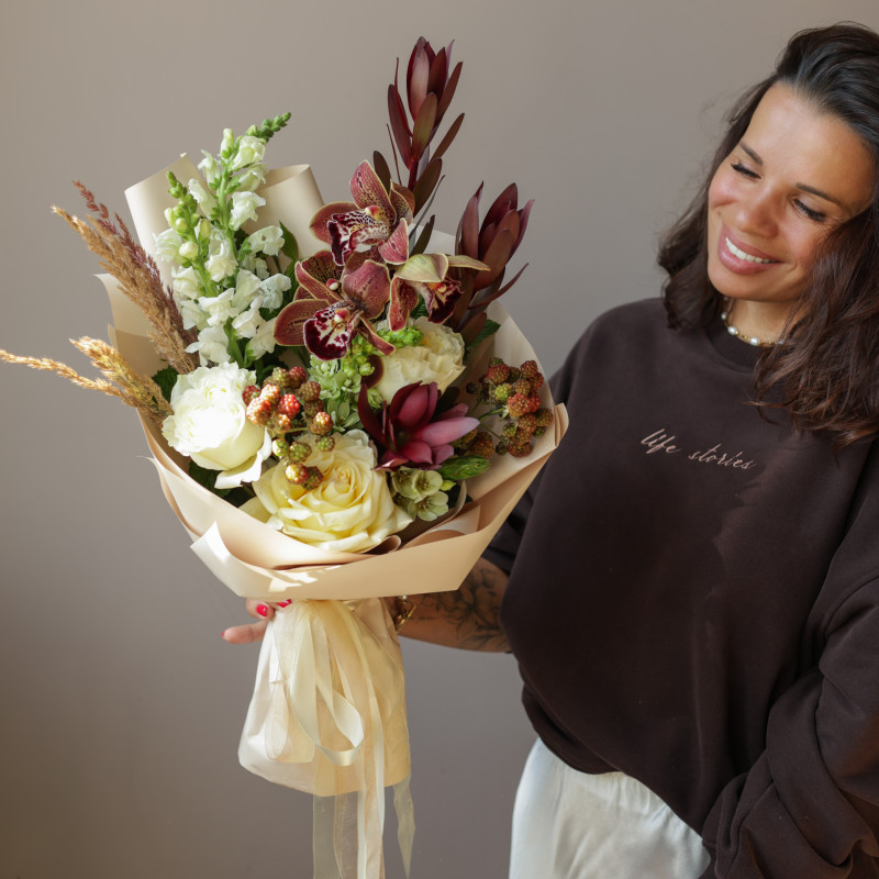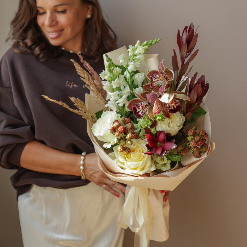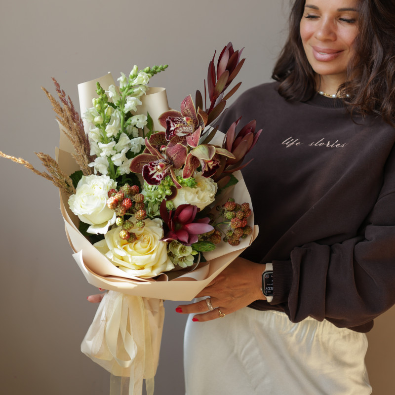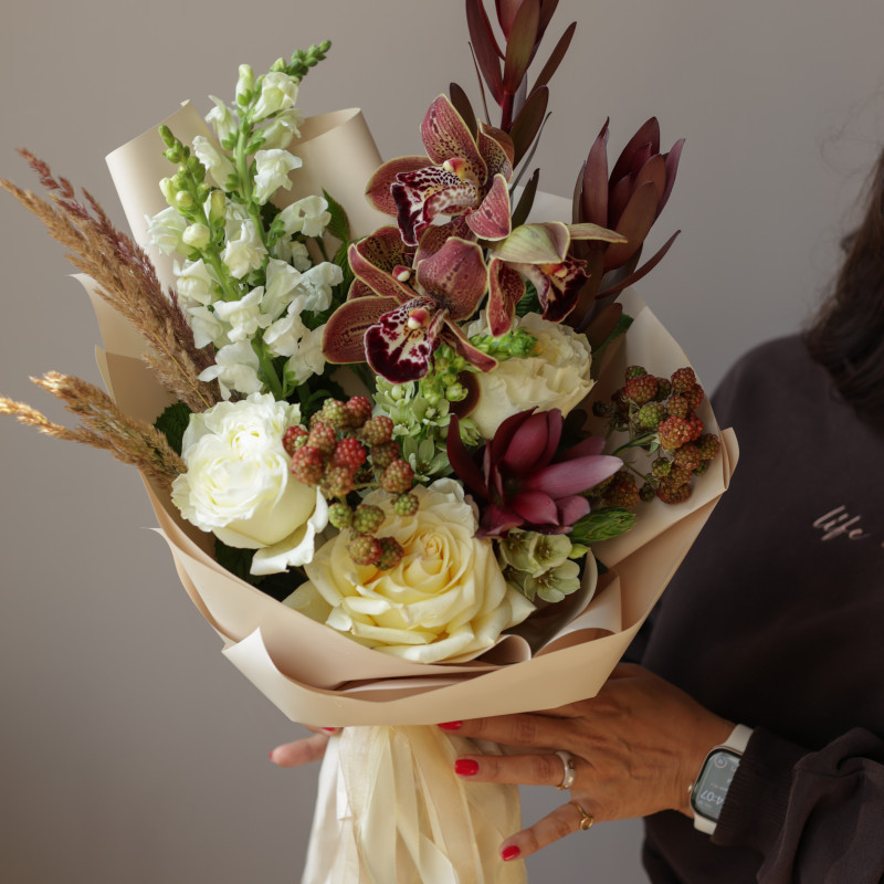 Пышные белые розы, экзотические бордовые орхидеи и львиный зев создают гармоничное и праздничное настроение, а ягоды ежевики и декоративная зелень добавляют свежие природные акценты. Дизайнерская упаковка и длинные ленты делают букет стильным и готовым к подарку.