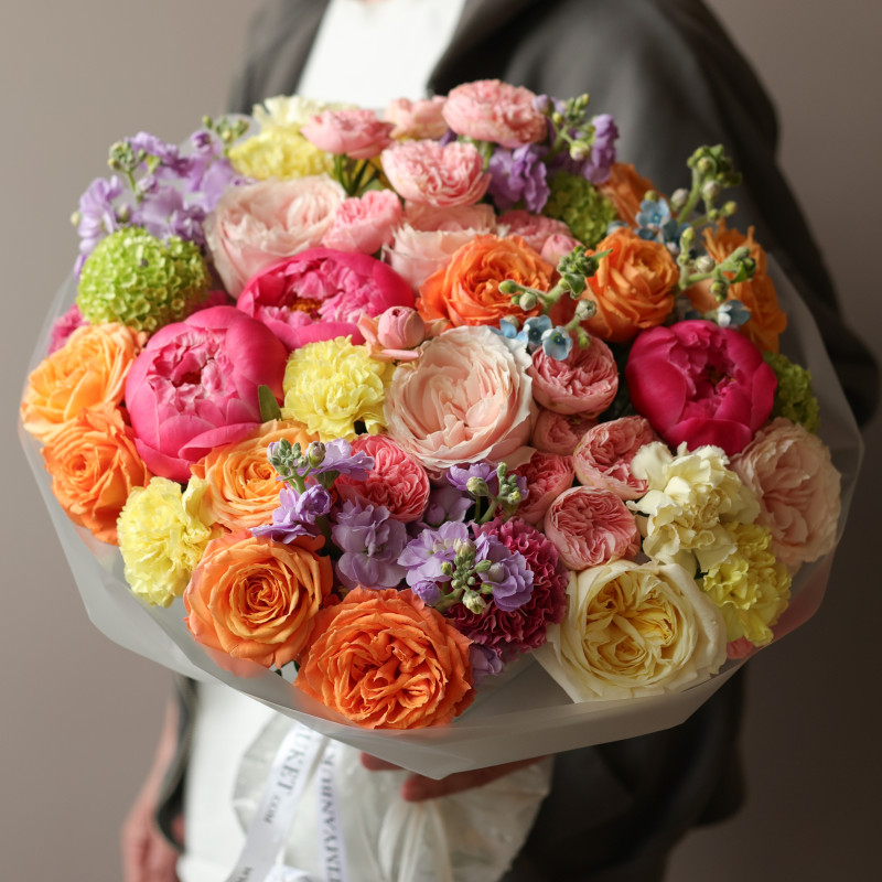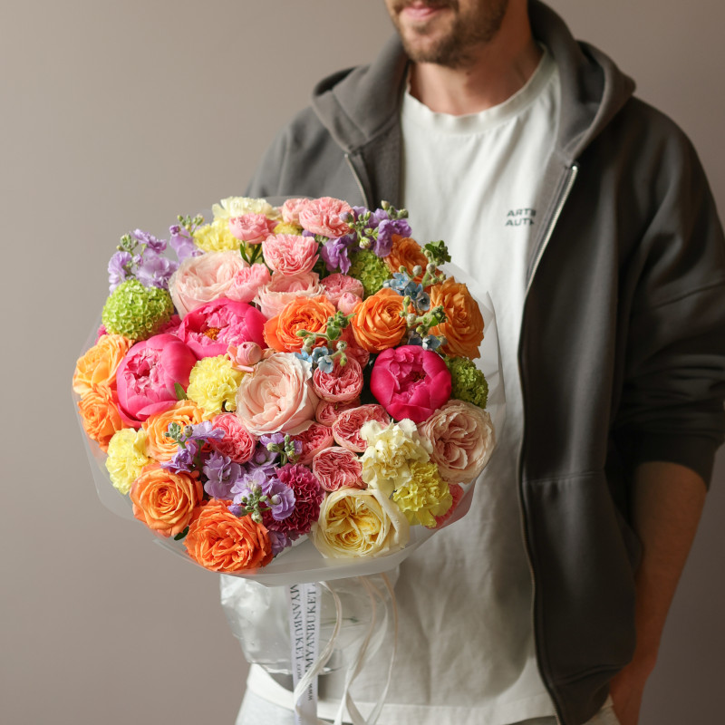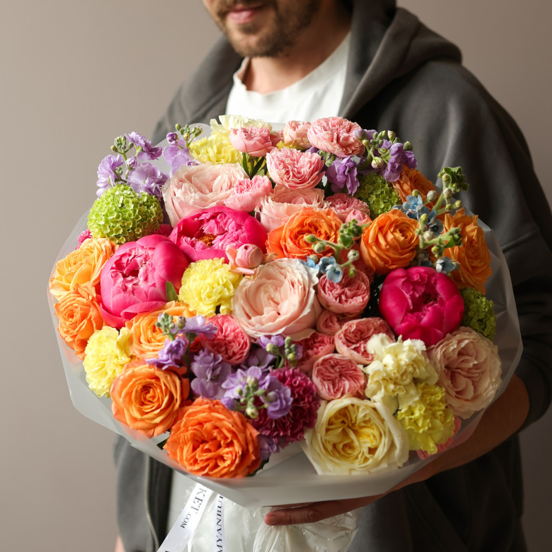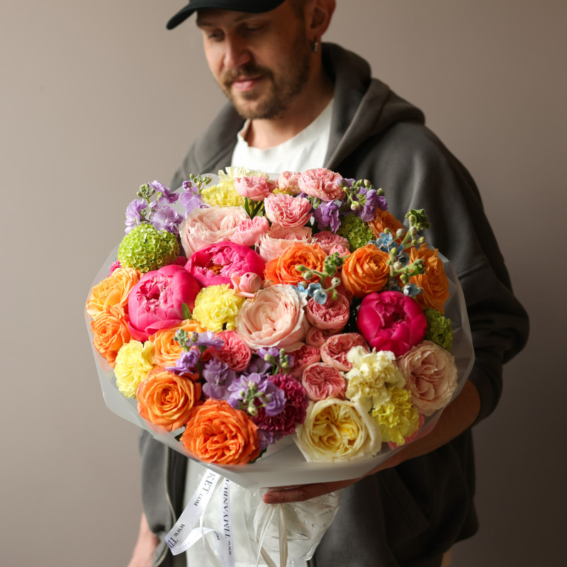 Круглый «дофаминовый» букет с ярким характером — насыщенный, живой и эмоционально заряженный. Малиновые пионы задают мощный акцент и глубину, оранжевые и лимонные пионовидные розы добавляют солнечную энергию, а нежно-розовые розы и кустовая «Джульетта» смягчают композицию и придают ей романтичность. Сиреневая маттиола и голубые оксипеталумы создают цветовой контраст и воздушность, лаймовая гортензия добавляет свежесть и объём, а диантус связывает все оттенки в цельную, многослойную композицию. Идеален для вау-эффекта, яркого подарка и эмоций «с первого взгляда».
