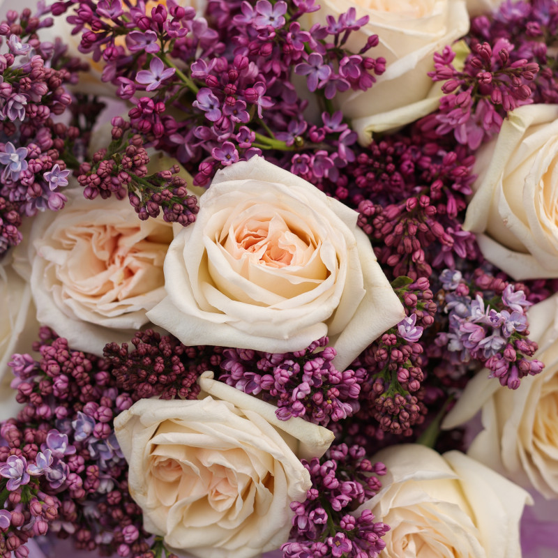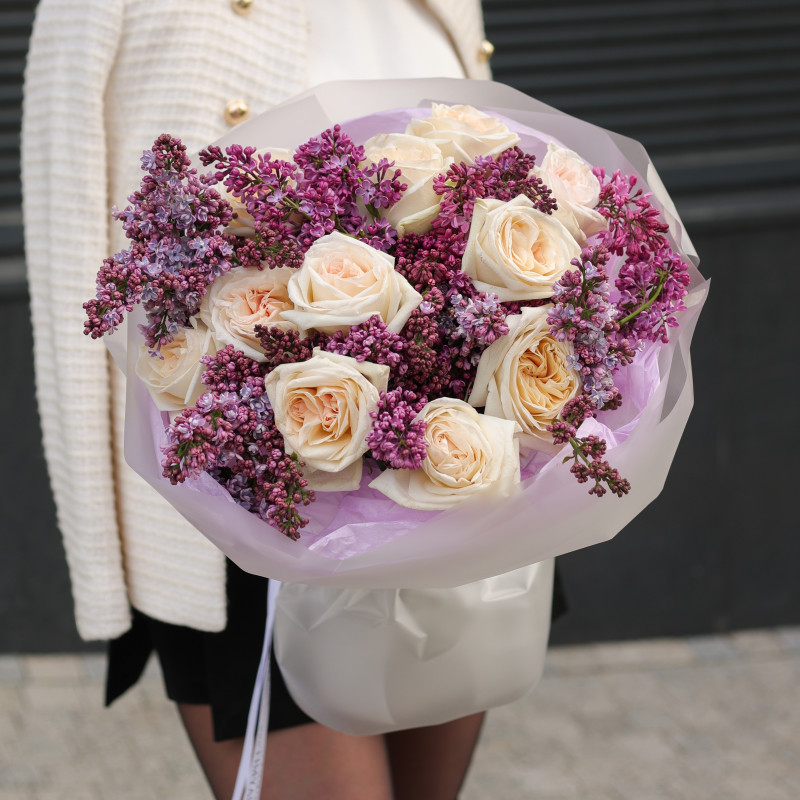 Круглый букет роз Вайт Охара с сиренью
