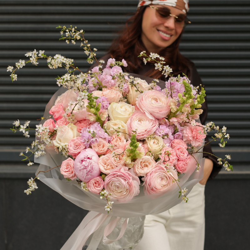Круглый букет с миксом пионовидных роз, пионами и цветущими ветками