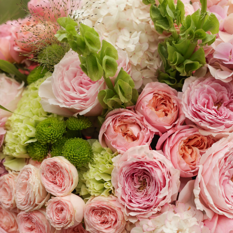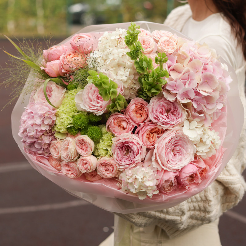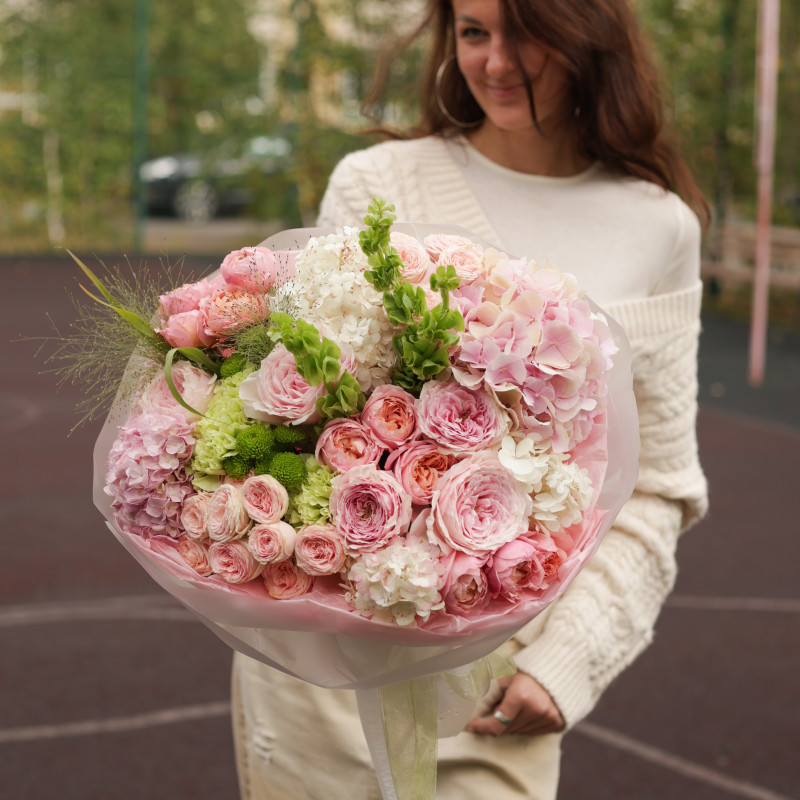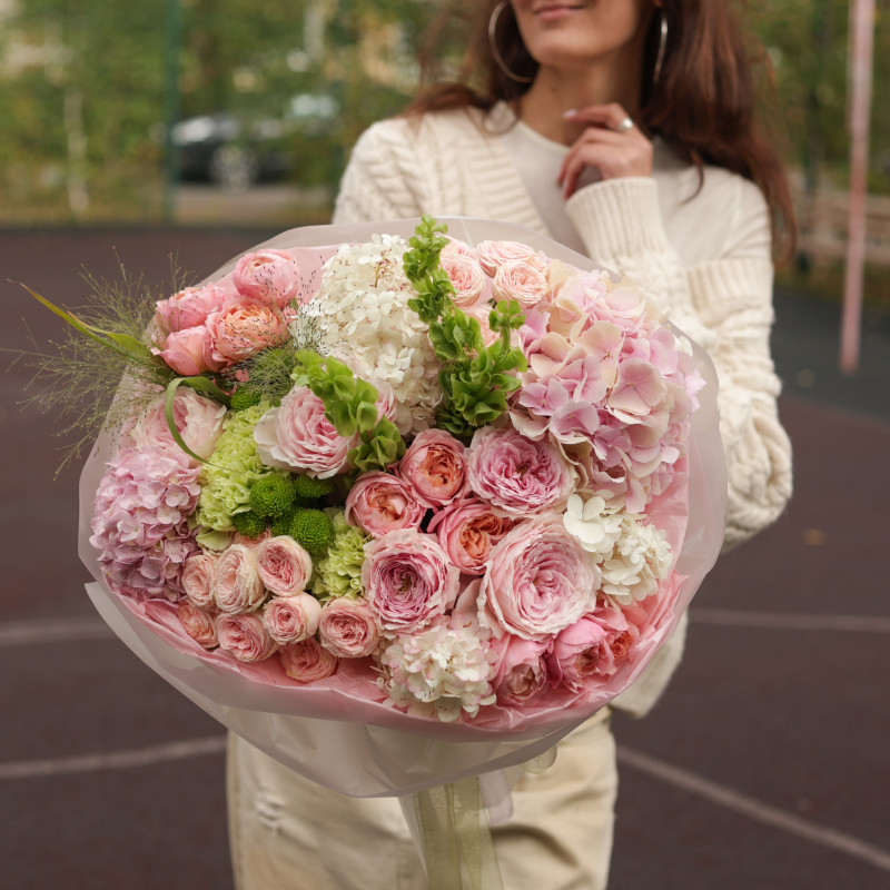 Состав: микс пионовидных роз пудрово-розового оттенка, гортензия, диантус, микро-хризантемы лаймовые, декоративная зелень.
