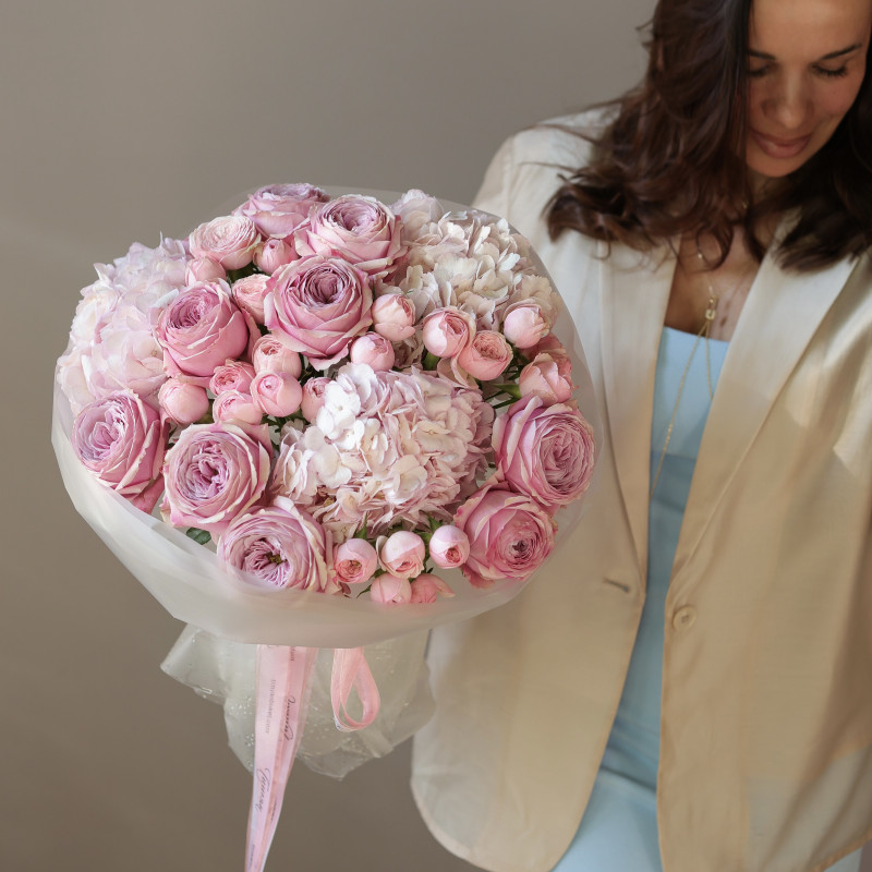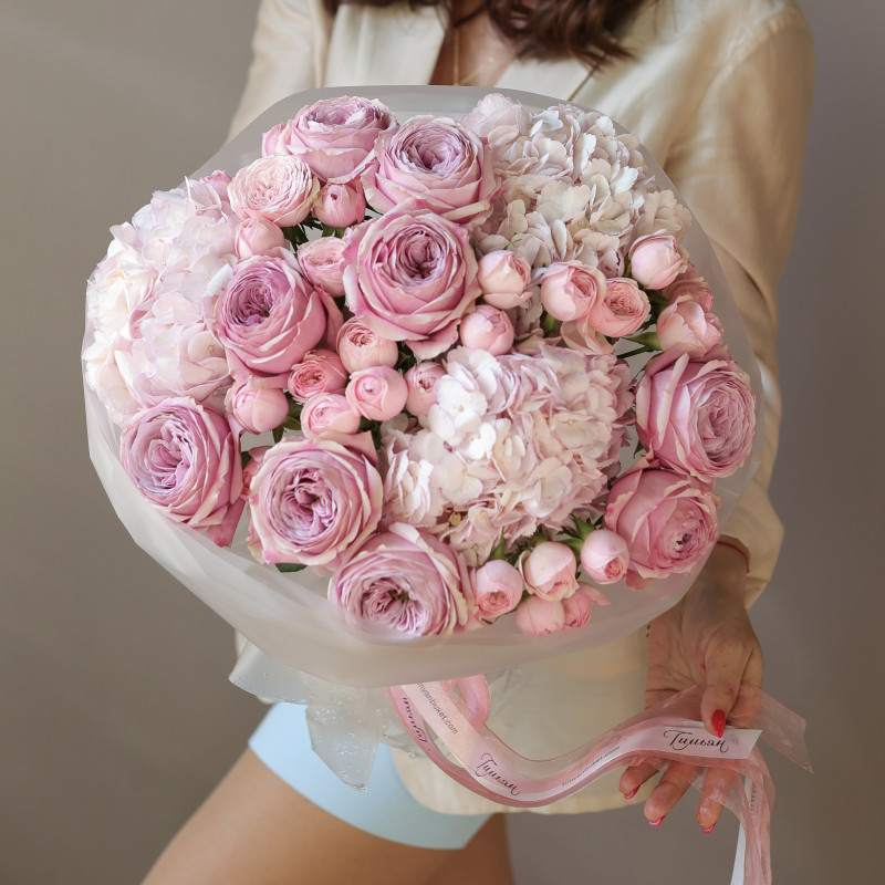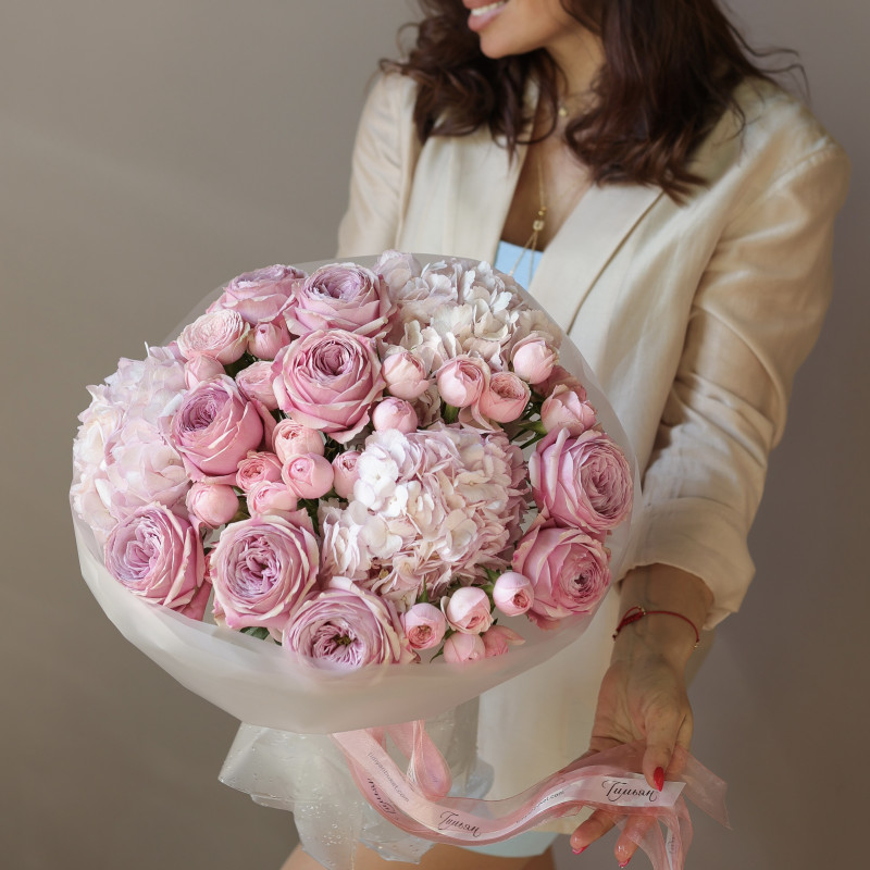 Круглый букет с пионовидными розами, кустовыми розами и гортензией
