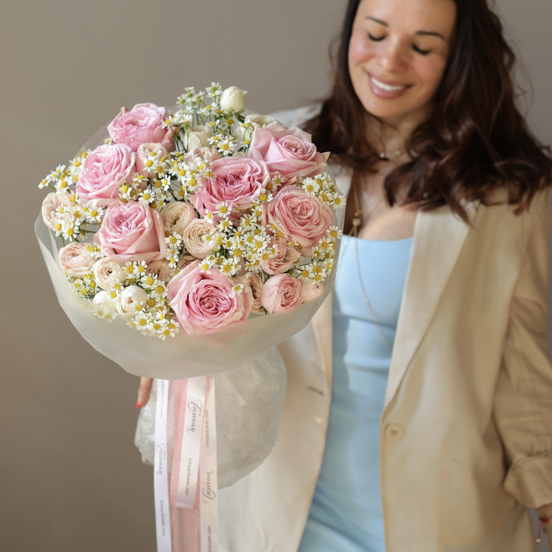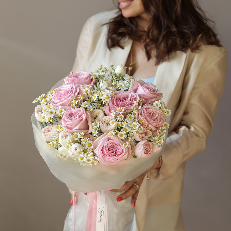 Круглый букет с розами и ромашками