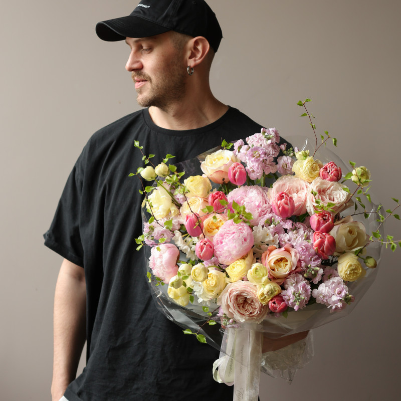 Нежный и яркий круглый букет с розовыми пионами и тюльпанами оттенка лосось — свежий, живой и выразительный. Пионы создают пышную романтичную основу, пионовидные кустовые розы лимонного оттенка добавляют мягкий солнечный акцент, сиреневая маттиола привносит глубину и лёгкий аромат, а мини-нарциссы усиливают весеннее настроение. Декоративные веточки добавляют естественность и динамику композиции. Полупрозрачная упаковка с лентами подчёркивает гармонию оттенков и аккуратную круглую форму. Идеален для особого повода, тёплого поздравления или красивого знака внимания.