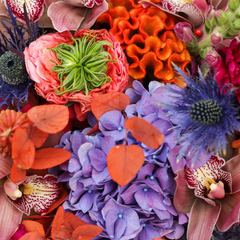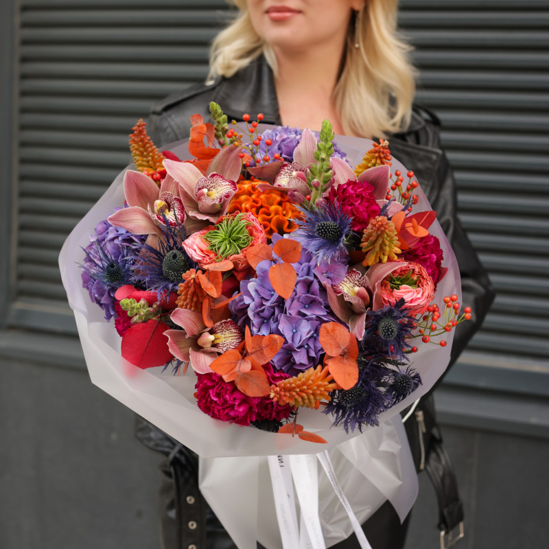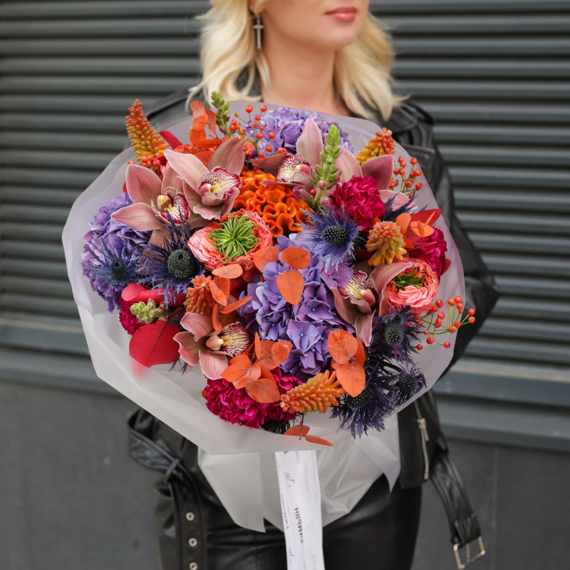 арт. 6136Круглый букет в яркой цветовой палитре — эффектная и динамичная композиция с насыщенными контрастными оттенками. Целозия и книфофия создают текстурный акцент, пионовидная роза «Мандарин» и малиновый диантус добавляют яркости и тепла, фиолетовая гортензия и карамельная орхидея придают объем и изысканность, а декоративные сине-фиолетовые колючки создают интересный графичный элемент, делая букет современным и выразительным.