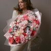 Состав: пионовидные розы, кустовые пионовидные розы, французские розы, маттиола, озотамнус, эвкалипт.