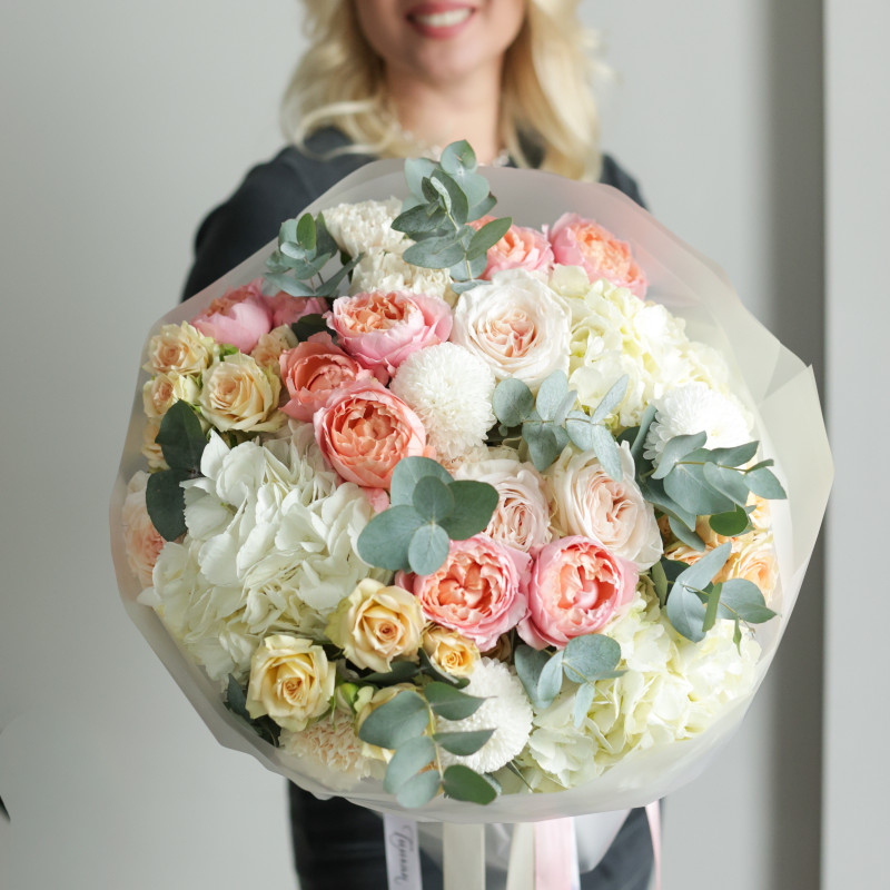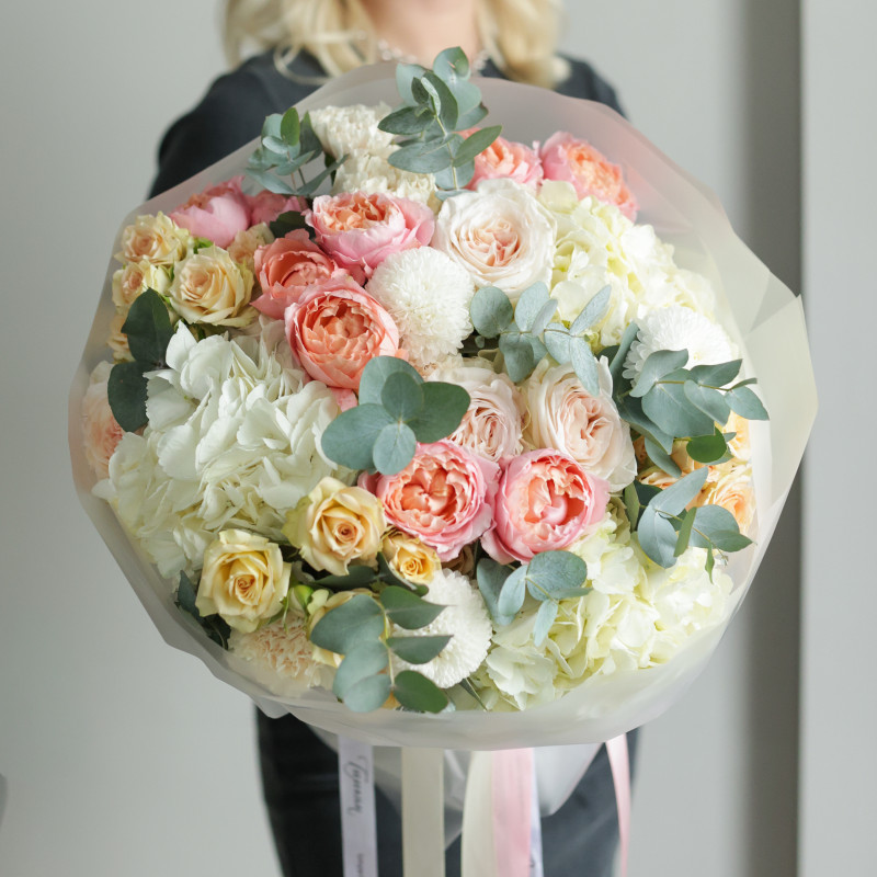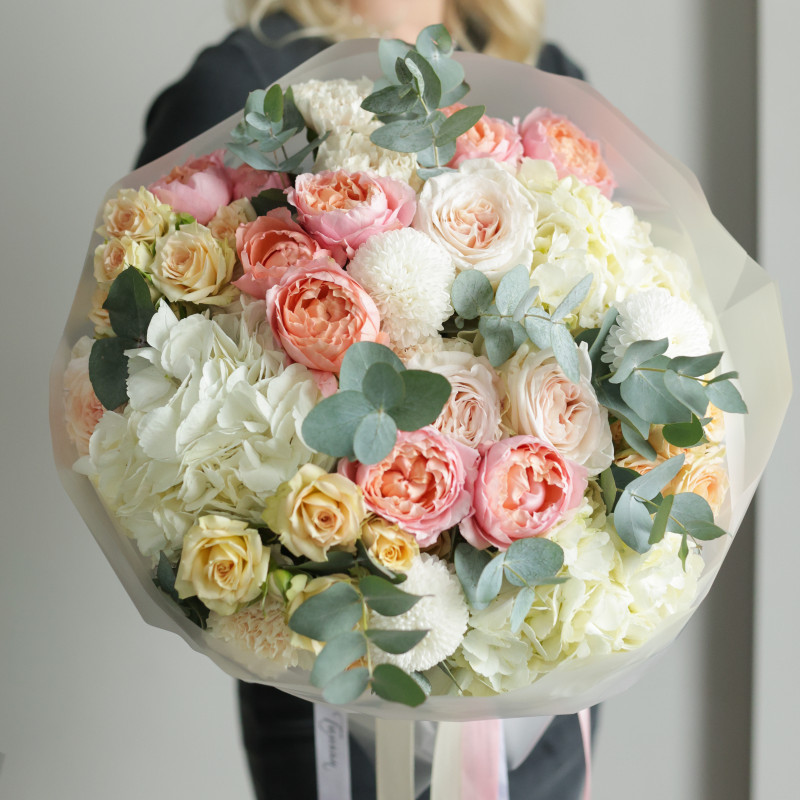 Шикарный нежный круглый букет с пионовидными розами и гортензией — изысканный подарок, наполненный мягкой романтикой и утончённой элегантностью. Пышные пионовидные розы и классические розы образуют воздушную основу композиции, диантус добавляет текстурности, а гортензия — объёма и лёгкой облачности. Эвкалипт привносит свежесть и современное звучание, а полупрозрачная упаковка с длинными лентами подчёркивает чистоту оттенков и округлую форму букета. Идеален для дня рождения, романтического повода, свадьбы, годовщины или как красивый жест внимания без повода.