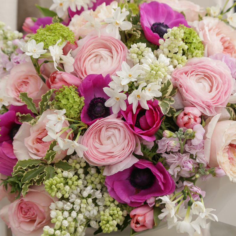 Изысканный ароматный весенний букет с сиренью, ранункулюсами и анемонами