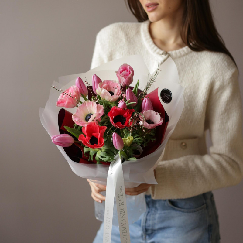 Очаровательный букет с анемонами и тюльпанами. Бережно упакован в дизайнерскую бумагу и декорирован длинными лентами.