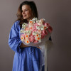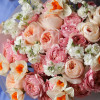 Потрясающий букет с миксом пионовидных роз, маттиолы и весенних нарциссов. Декорирован длинными лентами.