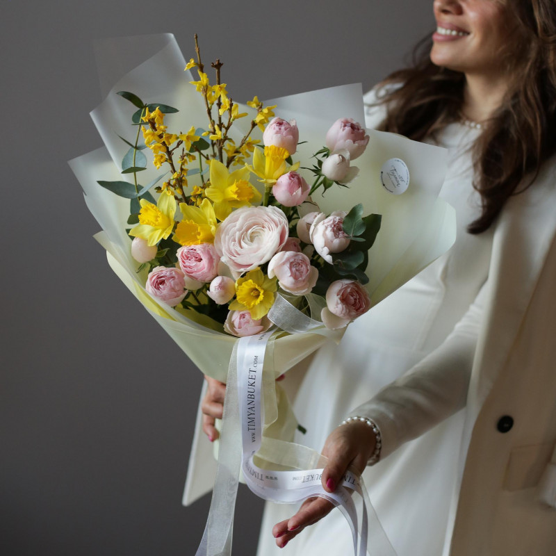 Яркий и сочный букет-растрепыш с нарциссами, розами и ранункулюсом. Бережно упакован в дизайнерскую бумагу и декорирован длинными лентами.