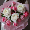 Стильный букет с пионовидными тюльпанами и ранункулюсами. Бережно упакован в дизайнерскую бумагу и декорирован длинными лентами.