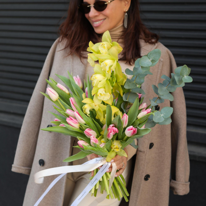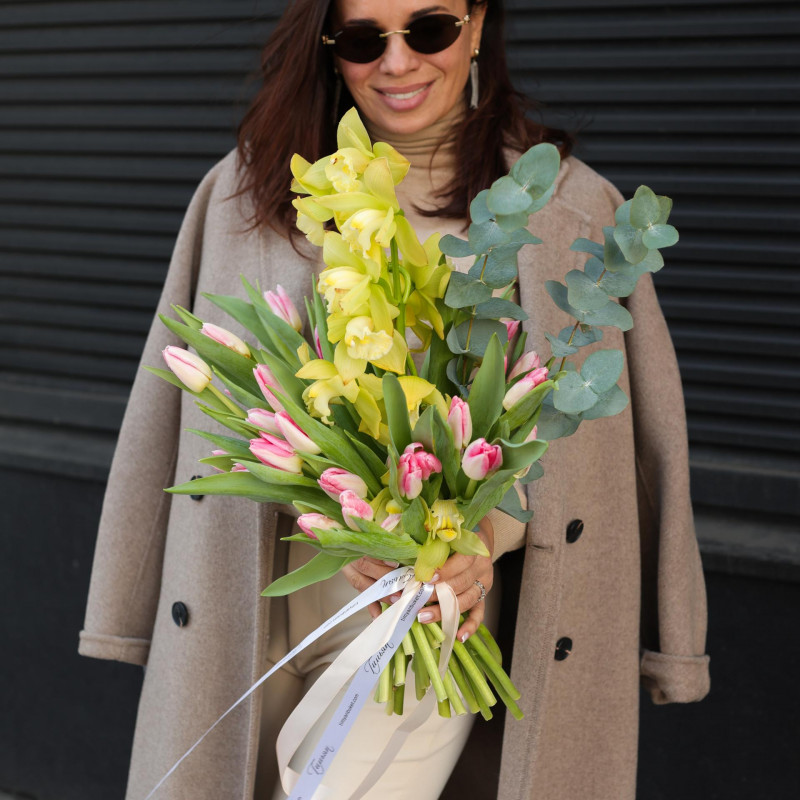 Букет с лаймовой орхидеей и тюльпанами