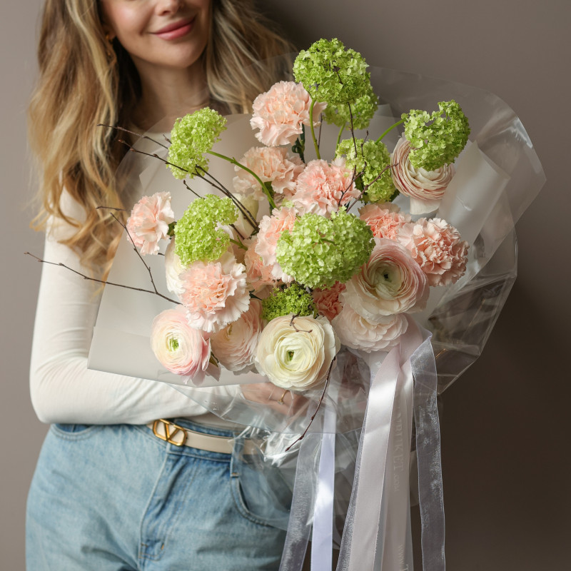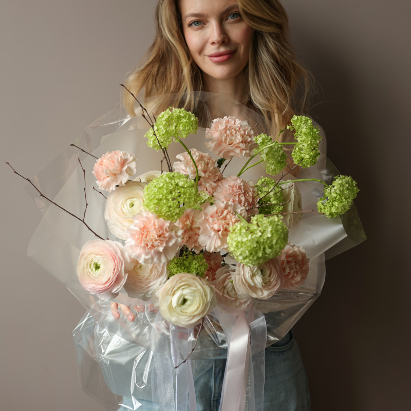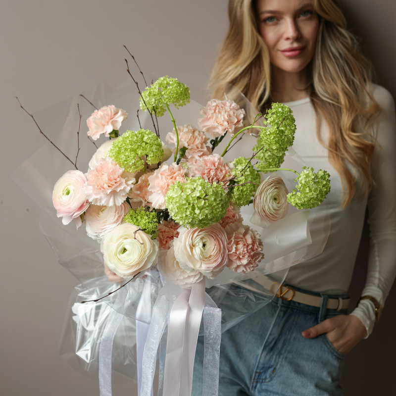 Букет с ранункулюсами, лаймовой гортензией и диантусом