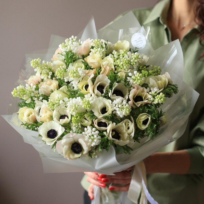 Необычный и очень стильный букет с веточками ароматной сирени и молочными анемонами