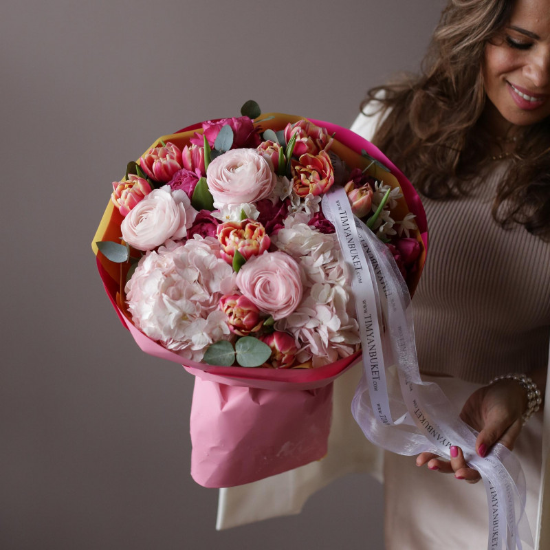 Прекрасный яркий букет с необычными тюльпанами и нежными ранункулюсами. Бережно упакован в дизайнерскую бумагу и декорирован длинными лентами.